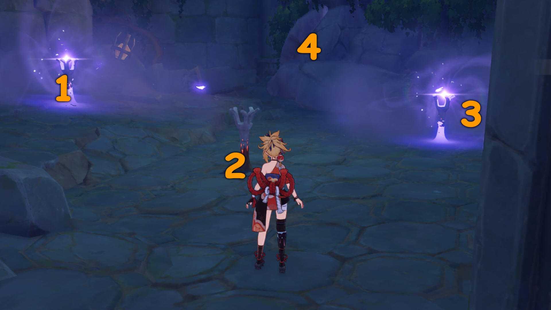 Чтобы выбраться из тайной комнаты, нужно активировать четыре факела. Для начала используем Анемо умение на два факела, которые светятся синей энергией, потом разрушаем груду камней и активируем факелы в последовательности указанной на изображении ниже.