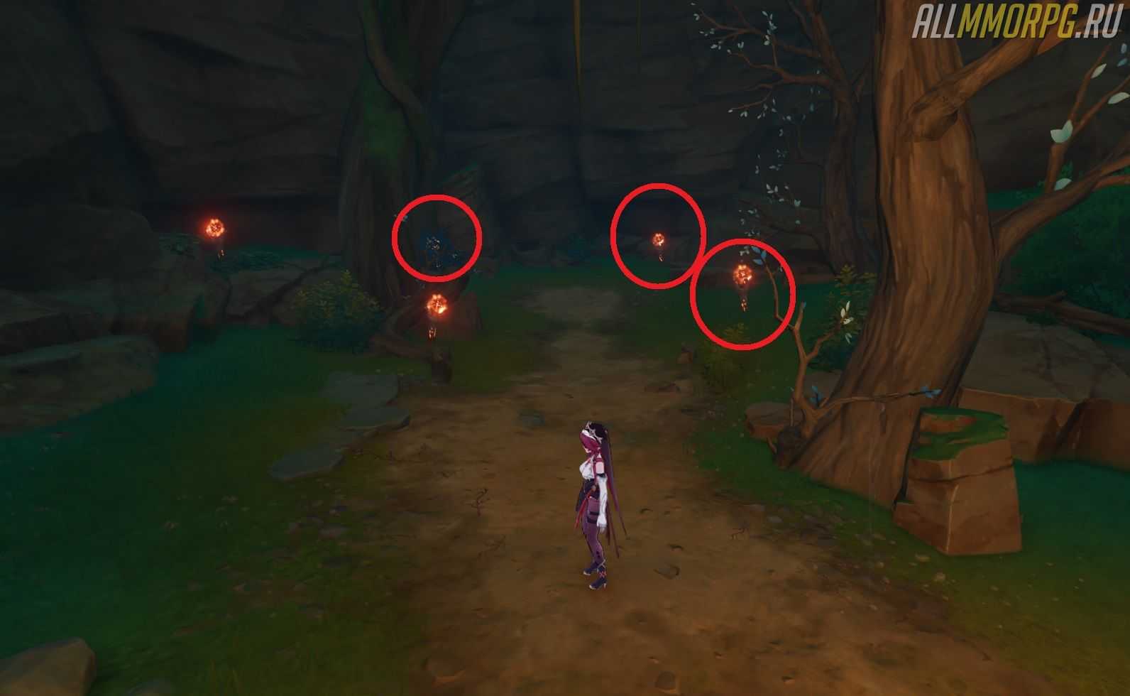 Если вы не поняли, какие именно факелы нужно поджечь, посмотрите изображение ниже. Красными кружочками обведены те, которые необходимо активировать.