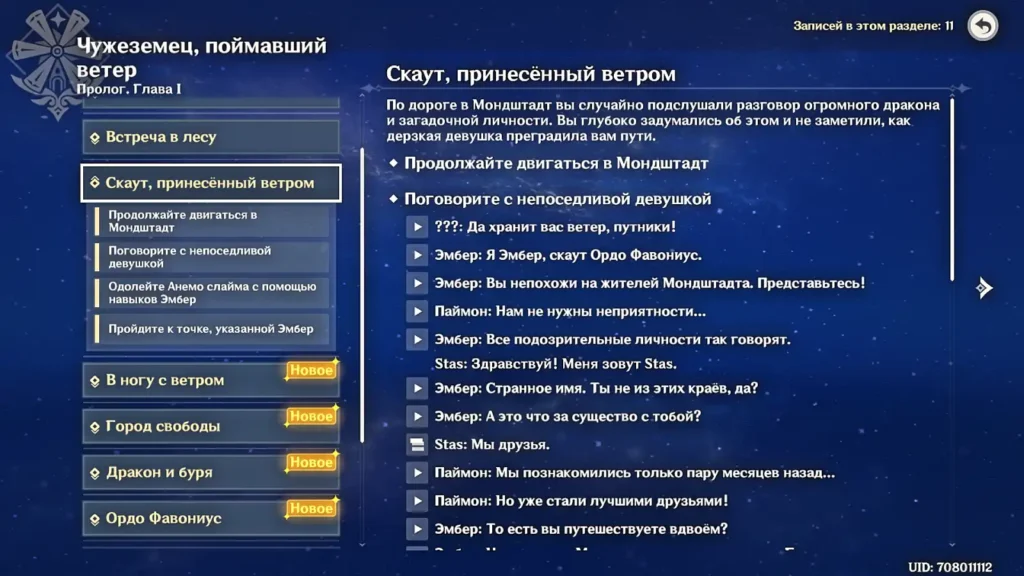 | Скаут, принесённый ветромПо дороге в Мондштадт вы случайно подслушали разговор огромного дракона и загадочной личности. Вы глубоко задумались об этом и не заметили, как дерзкая девушка преградила вам пути. | •Продолжайте двигаться в Мондштадт•Поговорите с непоседливой девушкой•Одолейте Анемо слайма с помощью навыков Эмбер•Пройдите к точке, указанной Эмбер |