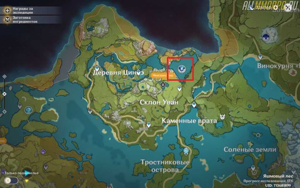 Чтобы сразиться с Океанидом, отправляйтесь на север региона Ли Юэ. Если вы уже исследовали эту область, то воспользуйтесь ближайшим телепортом – Долина Бишуй, Ли Юэ. Также в качестве точки перемещения вы можете использовать вход в подземелье Скрытый дворец Уван. Сам Океанид находится на платформе посреди озера. Чтобы вызвать его на поединок, подойдите к белому пятну на платформе и нажмите кнопку F. На изображении ниже отмечено местоположение босса.