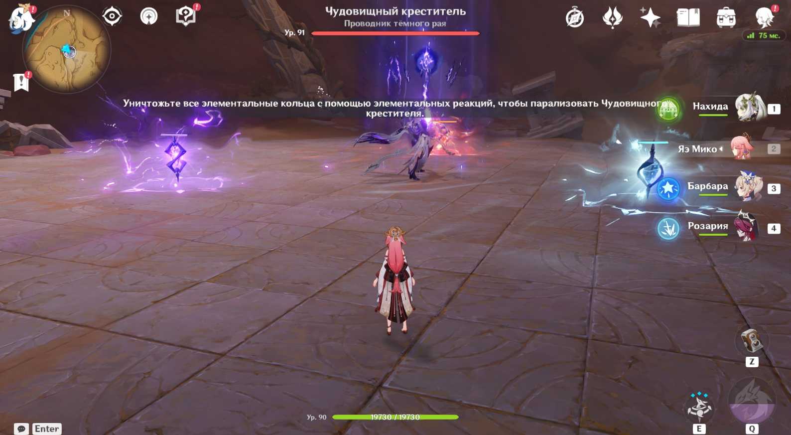 На старте боя он создает Элементальные кольца, которые можно уничтожить с помощью любых реакций стихий. После их разрушения босс на время будет парализован.