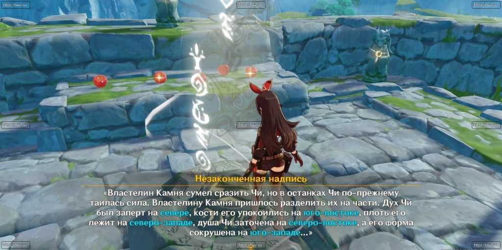 То есть задача сводится к тому, чтобы вы подошли к каждой статуе, сориентировались точно в направлении её взгляда и определили, направлен ли её взгляд на ветряные руины, заснеженный пик, обитель Адептов или гавань Ли Юэ.
