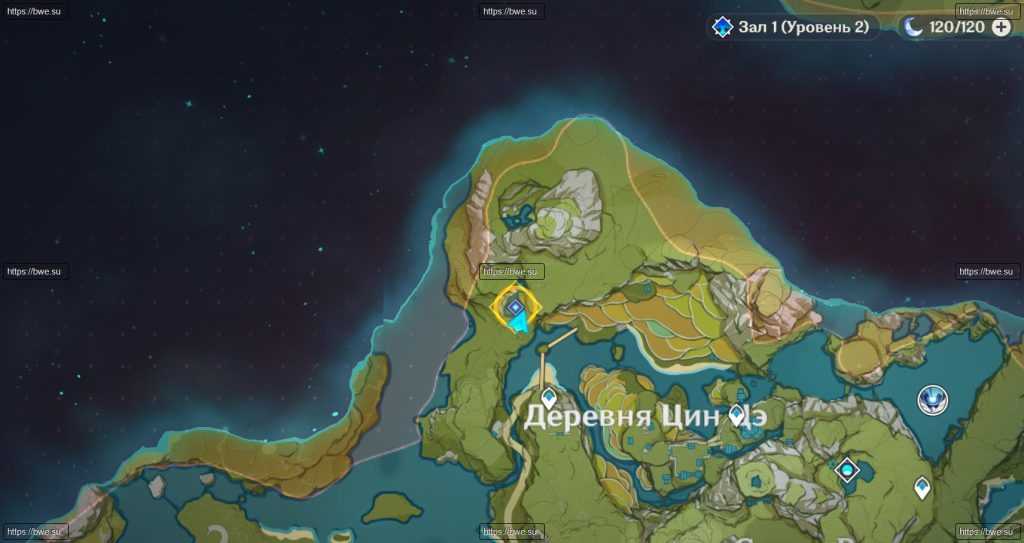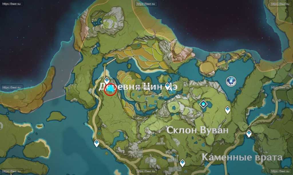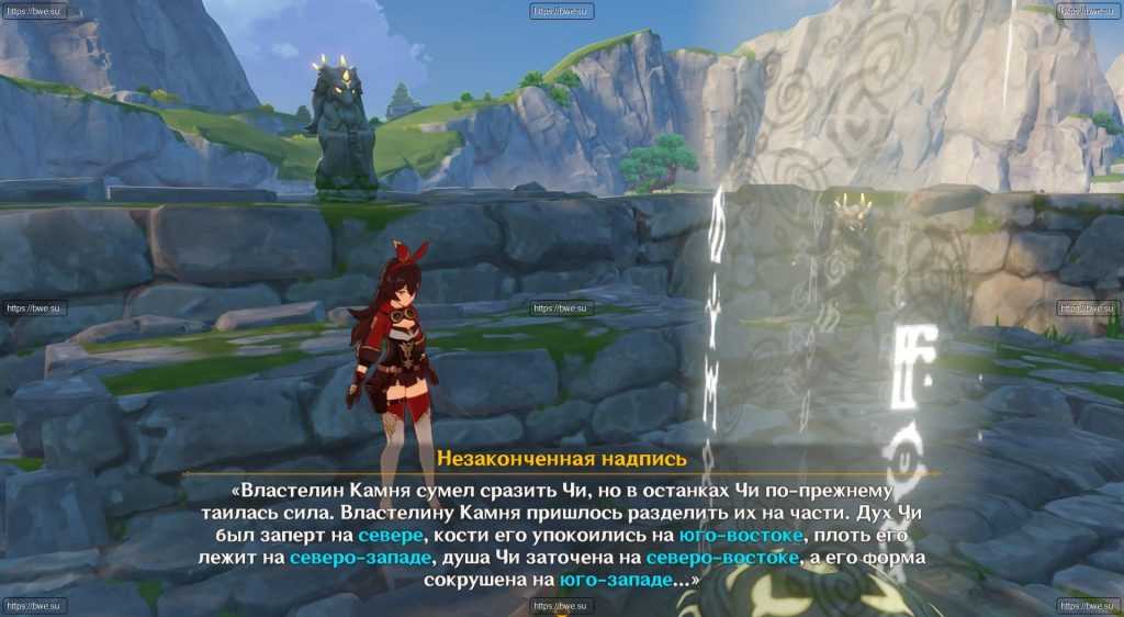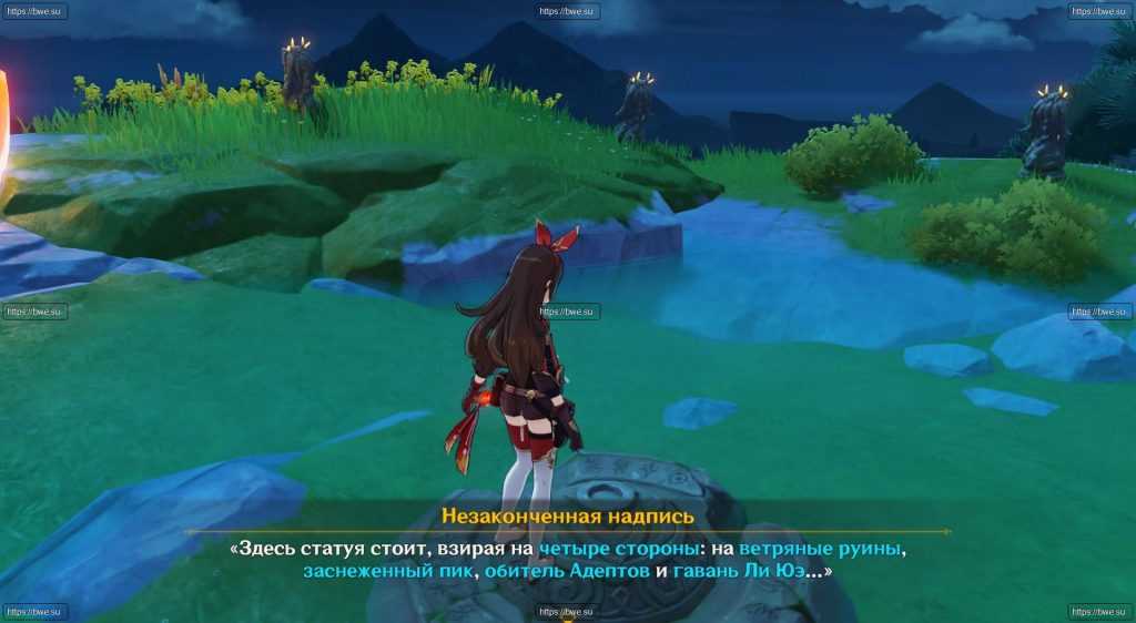 Дальнейшее описание квеста введёт вас в заблуждение, как ввело и нас. Никакой статуи Гео Архонта к западу от деревни нет – видимо, у почтенной старушки Жо Синь уже начались проблемы с памятью. К западу от деревни есть только точка телепорта и именно туда вам следует попасть.