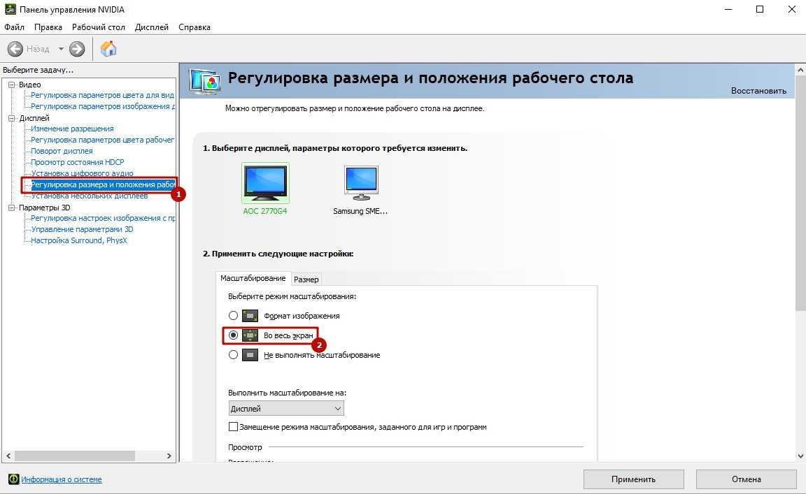 В первую очередь желательно установить на видеокарту самые свежие драйверы: очень часто в патчах можно найти исправления, связанные с совместимостью старых приложений. Для этого вы можете использовать Snappy Driver Installer или DriverPack Solution. Но обновления не всегда исправляют ситуацию. Вы также должны выбрать вариант просмотра рабочего стола. Для этого откройте панель управления видеокартой. Обычно в системном трее (маленькие значки в правом нижнем углу рабочего стола) есть соответствующий значок. Если его там нет, попробуйте щелкнуть правой кнопкой мыши на рабочем столе и найти этот пункт в раскрывающемся меню. Если вы не можете найти его и там, попробуйте поискать в панели управления. В окне программы выберите «Настроить размер и положение рабочего стола». Активируйте пункт «Полный экран». Не забудьте подтвердить изменения и закрыть панель управления. После этого окно игры должно развернуться до полного размера.
