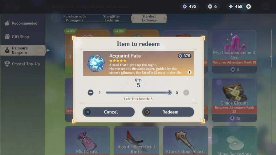 Use 10 wishes to the Beginner’s Wish menu using 8 Acquaint Fates.Use 10 wishes to the Ballad in Goblets using the free Intertwined Fate.Use 10 more wishes using your Primo Gems. You can use it on either the Ballad of Goblets or the Standard one.The standard one is better if you don’t want to get Venti. Venti’s chances are boosted by 50% in the Ballad of Goblet’s banner. But the actual chance to get a 5-star character remains the same.The 50% chance advertised in the banner only takes effect once you get the Gold Star which signifies you’ve managed to draw a 5-star character. Having Venti’s chances boosted at this point will only mess up your chances to get other characters like Keqing, Diluc or Mona.You still have Primo Gems at this point. Now go to Shop>>Paimon’s Bargains>>Stardust Exchange. Exchange your stardust for 4 Acquaint Fates.This will give you enough Acquaint Fates to summon 10 more wishes from the Beginner’s Wish Banner.Once you made your wish from the Beginner’s Wish Banner, go back to Paimon’s Bargains and exchange your stardust to as many as your leftover stardusts can for Acquaint Fates or Intertwined Fates.Note that you can only exchange 5 each per month.