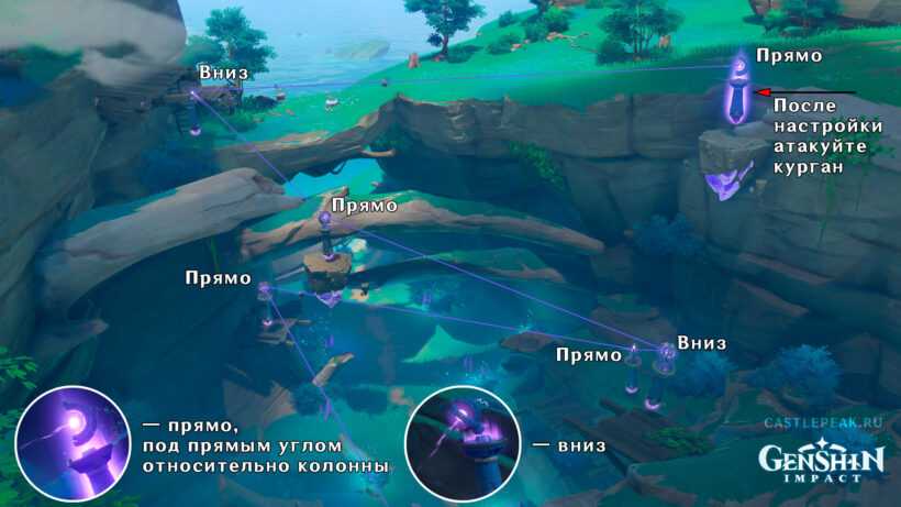 В отмеченном месте, прежде, чем решать головоломку с курганом и зеркалами, прибегните к помощи чувства стихий. Оно приведёт вас в местность с кучей электро монументов.