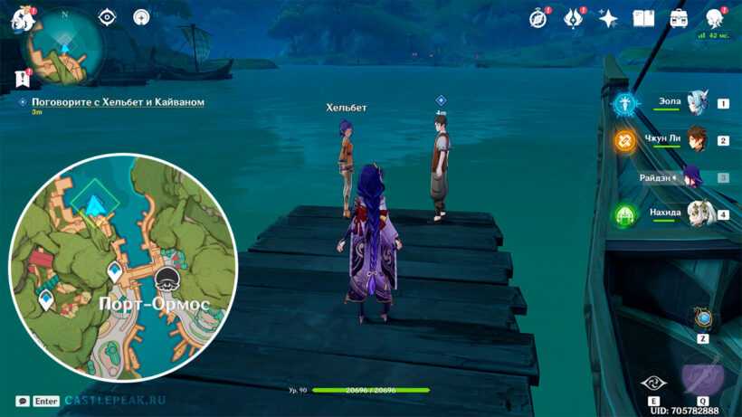 Там вы увидите Кайвана и Хельбет. Девушка из академии просит рыбака выловить антикварные вещи, которые по случайности упали с корабля в воду. Рыбак всеми силами пытается отказаться, но вам с Паймон удаётся его убедить помочь.