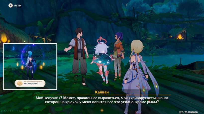 Девушка предложит рыбаку познакомиться с одним учёным из академии, который занимается рыбной ловлей, разрабатывая наживки и удочки. Кайван соглашается попробовать. После диалога задание «Чудодейственный крючок» завершится, и вы получите достижение «Что на крючке?» (5 Камней Истока).