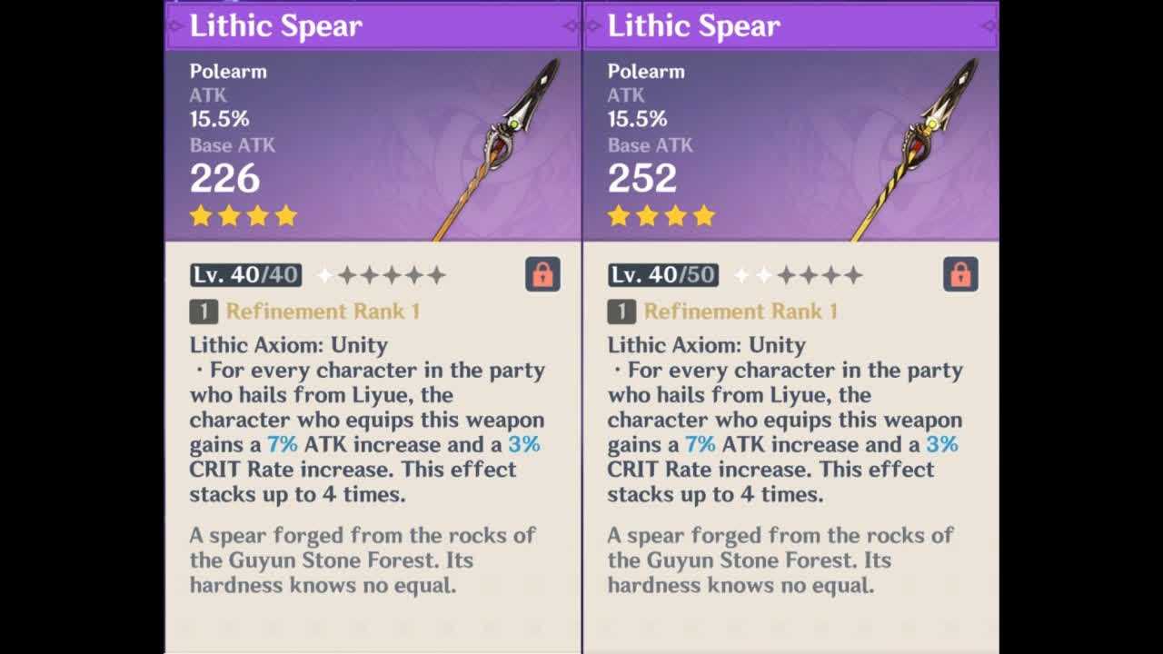 Каменное копье — оружие с четырьмя звездами и 44 единицами базового урона. Каждый член отряда из Ли Юэ будет усиливать атаку владельца этого копья на 7-11%. Шанс крита тоже вырастет — на 3-7%. Эффект складывается до 4 раз. То есть, специально для этого копья вы можете собрать команду из персонажей Ли Юэ и пользоваться максимальными бонусами. Правда, его придется прокачать, ведь усиления начального уровня выглядят слишком слабыми на фоне выполнения перечисленных условий.