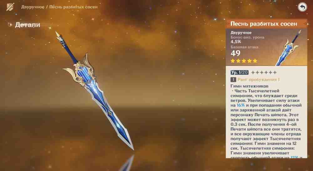 Клеймор Белой слепоты – это оружие Лиюе с базовой атакой 42, и оно дает 11,3% прирост защиты в качестве второстепенного свойства. Использование неэлементальной атаки дает игроку увеличение атаки и урона на 6%, которое может складываться до четырех раз.
