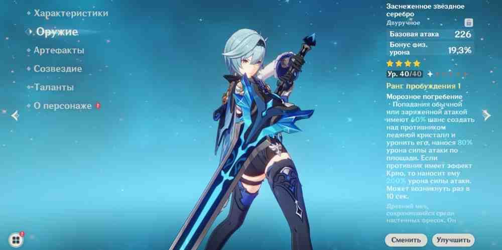 Заснеженное звездное серебро – это клеймор с базовой атакой 44 и второстепенным параметром, который дает бонус к физическому урону 7,5%. Как и другое оружие Драконьего Шпина, у него есть 60% шанс призвать крио-сосульку, чтобы нанести урон врагам.