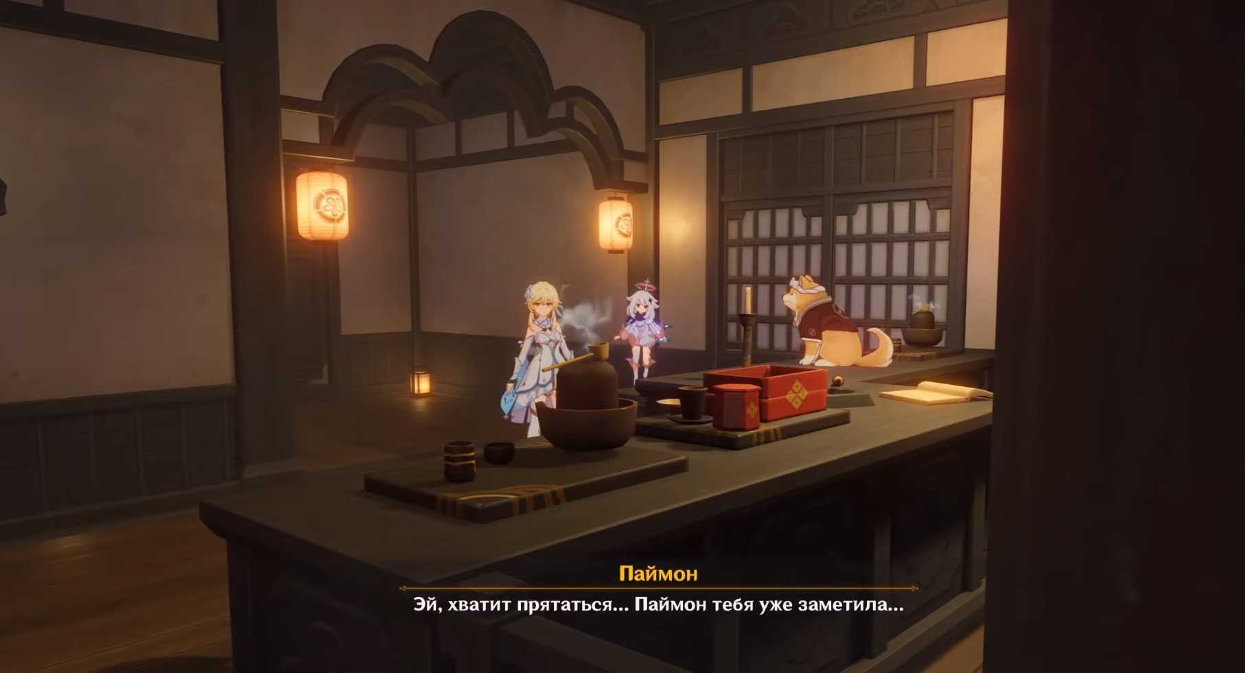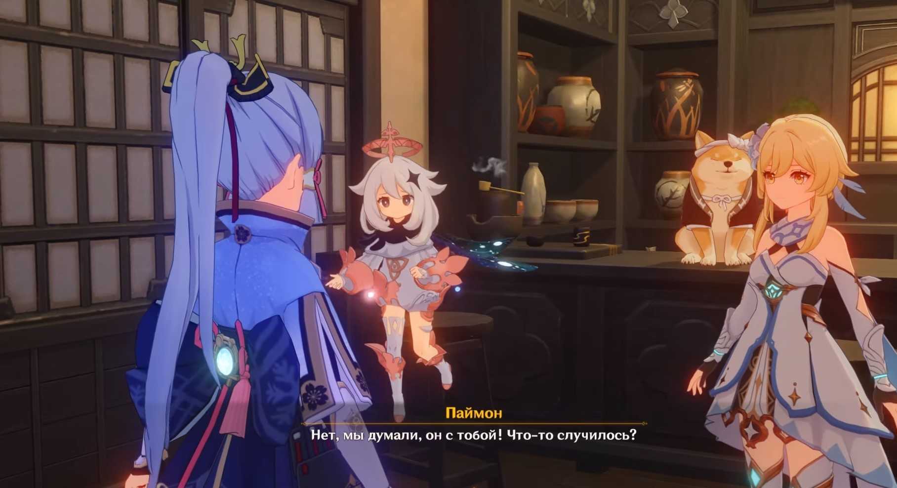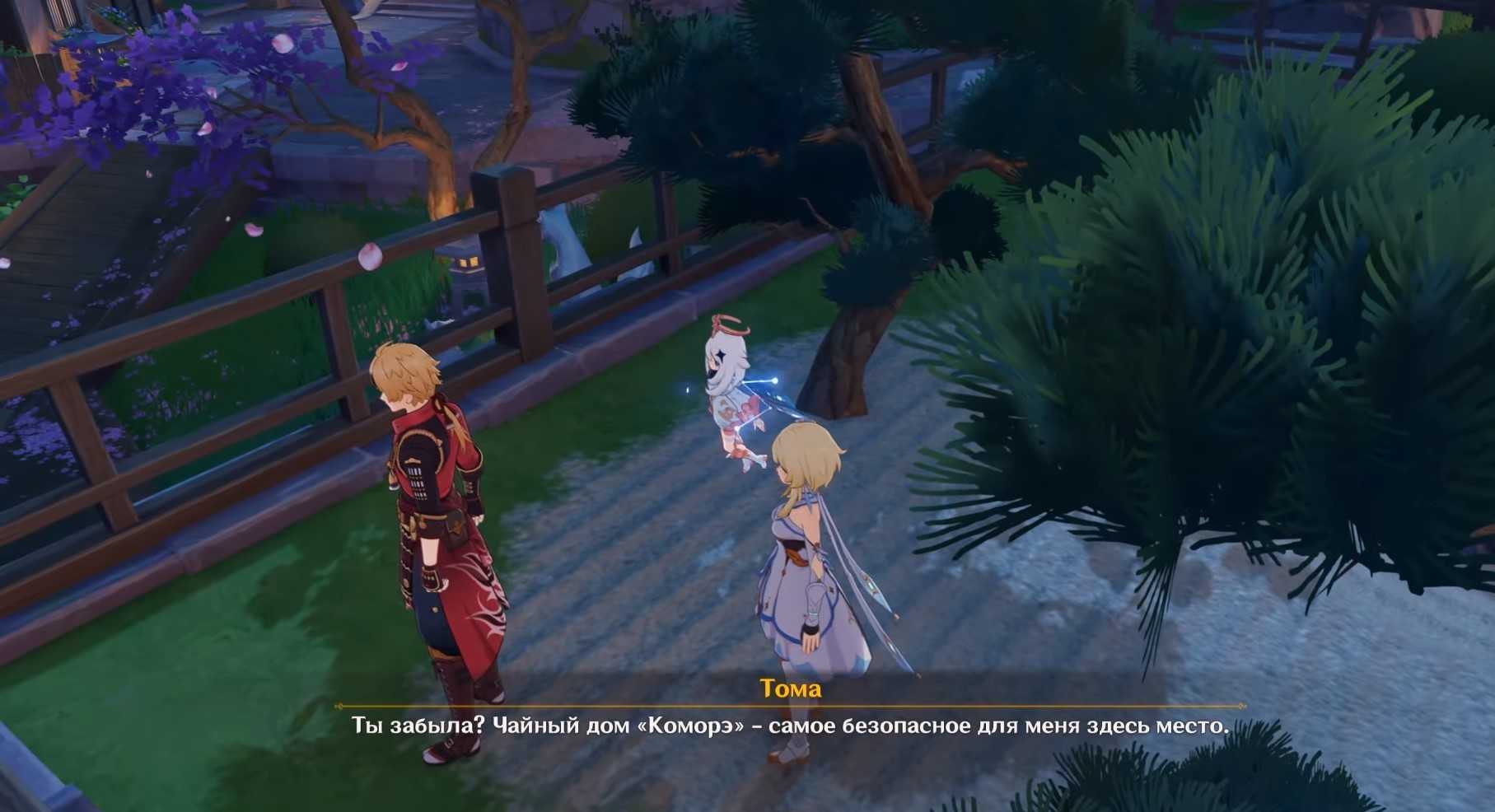 После выполнения основного задания первой главы необходимо выполнить сюжетные квесты Аяки и Еимии, чтобы открыть следующую часть истории. После прохождения миссий «Перешептывания журавля и белого кролика» и «Мечтательное безвременье» следуем в чайным домик и разговариваем с Камисато Аякой для активации задачи.