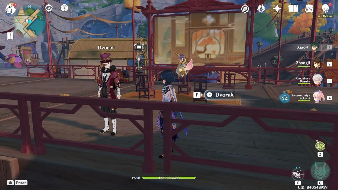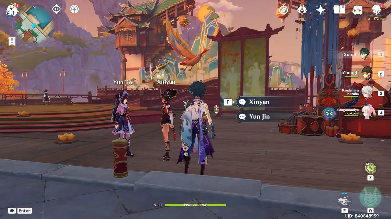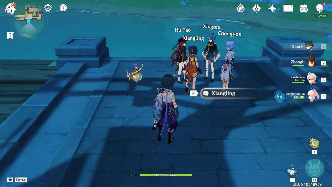 В квесте «Между фасадами и знакомыми лицами» Ху Тао приглашает множество людей на банкет и в конце предлагает проводить Чунюна, Сянлин и Синцю. Всех их можно найти вместе в южных доках гавани Лиюэ.