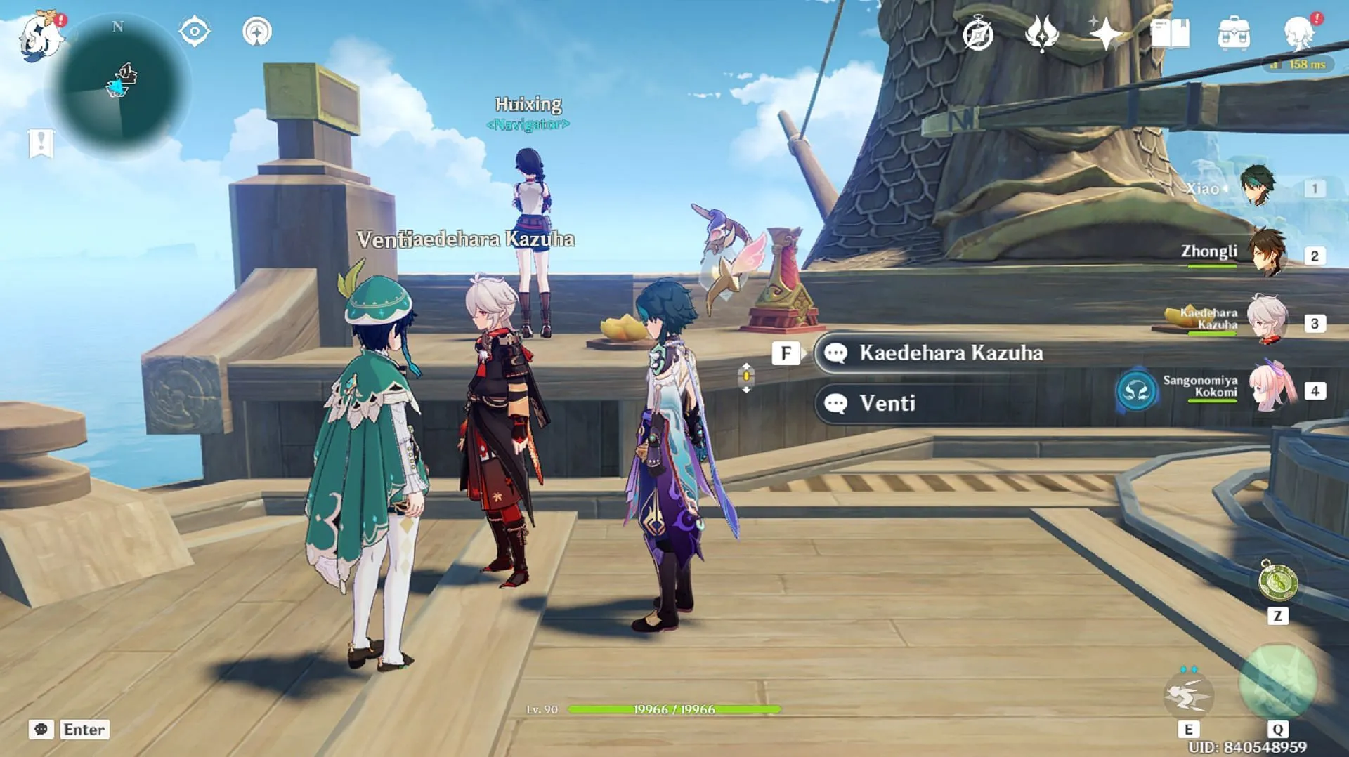 После квеста «Между фасадами и знакомыми лицами» вы можете найти Казуху и Венти на корабле Бэйдо «Алькор». Их можно увидеть болтающимися возле Хуиксина, NPC, с которым вам нужно взаимодействовать, чтобы сыграть в мини-игру «Бдительность в море».