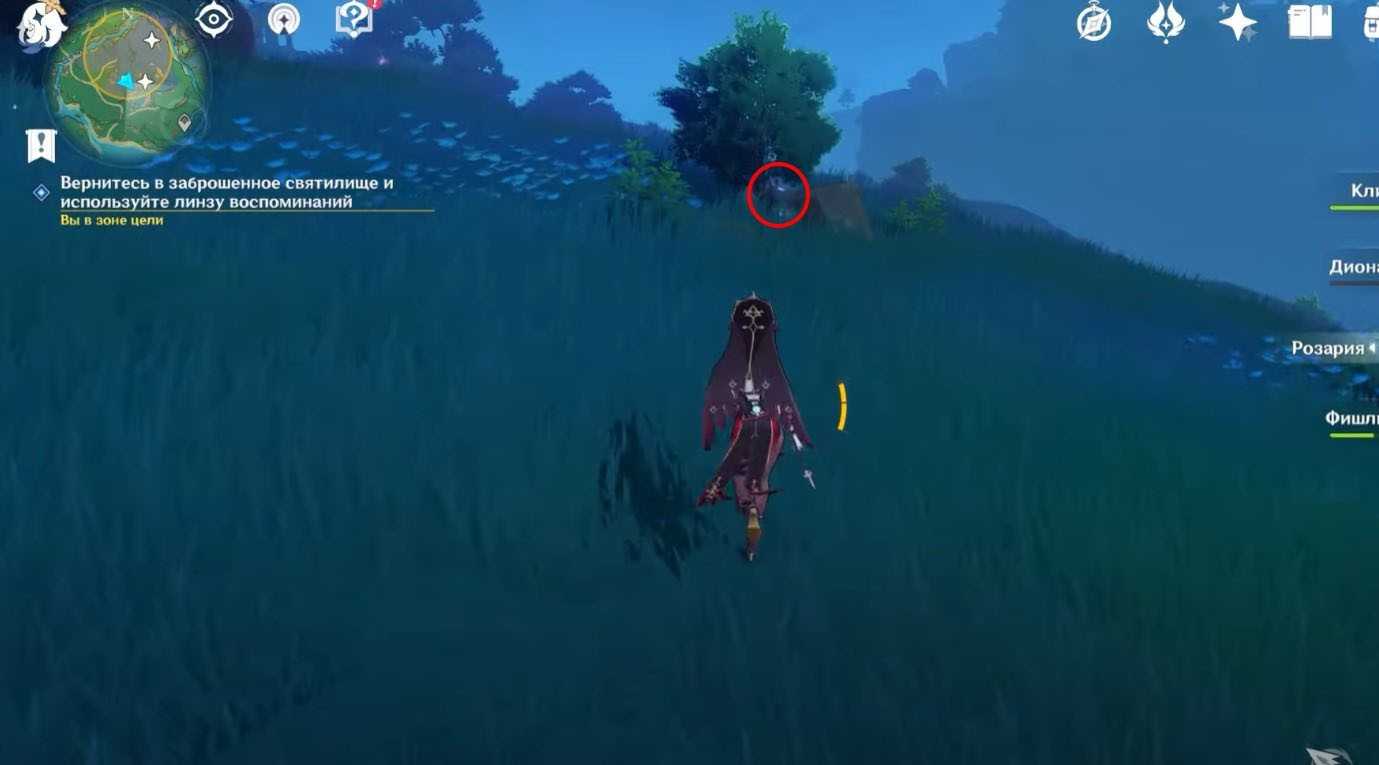 Как только взобрались на скалу – включите снова чувство стихий . След опять-таки окажется слева от Персонажа рядом с мини-лагерем хиличурлов.