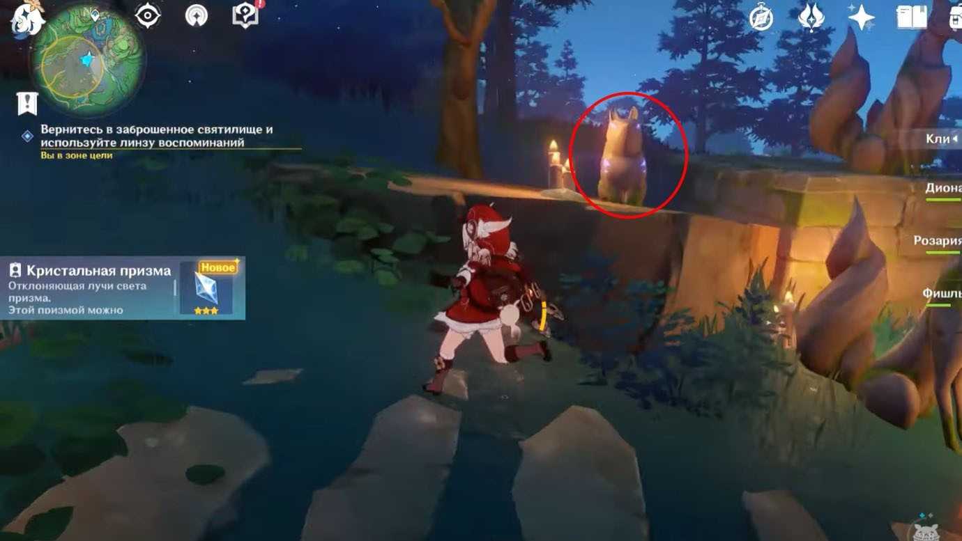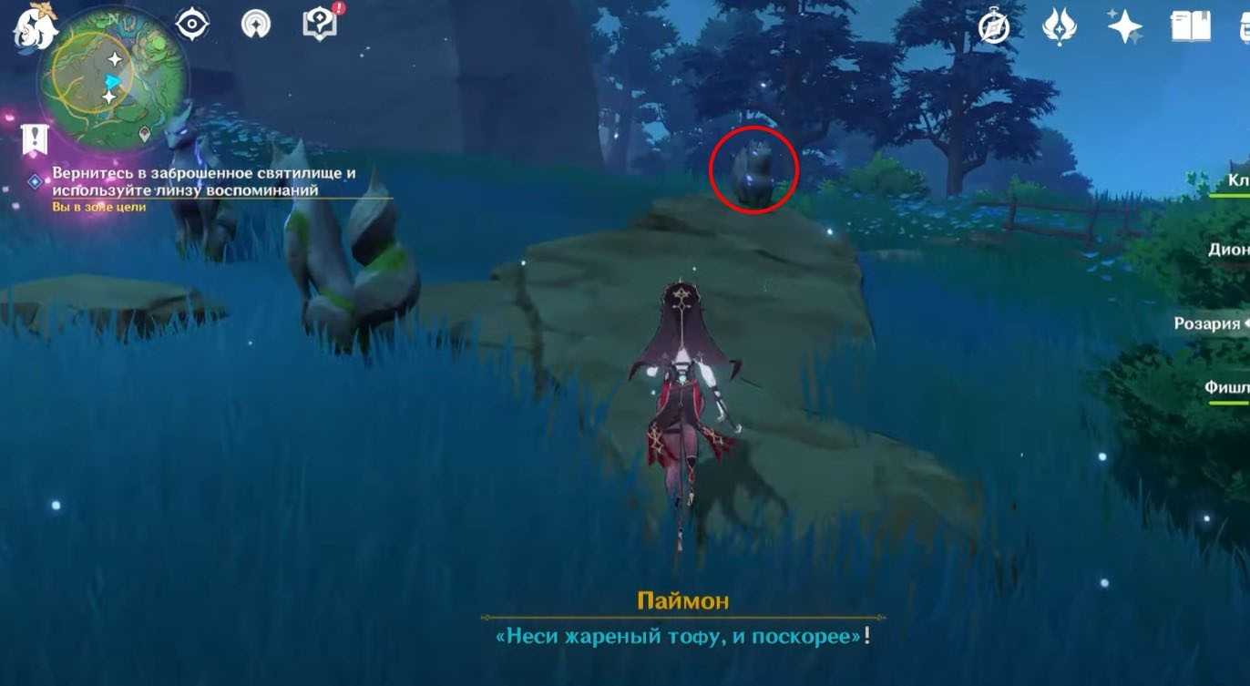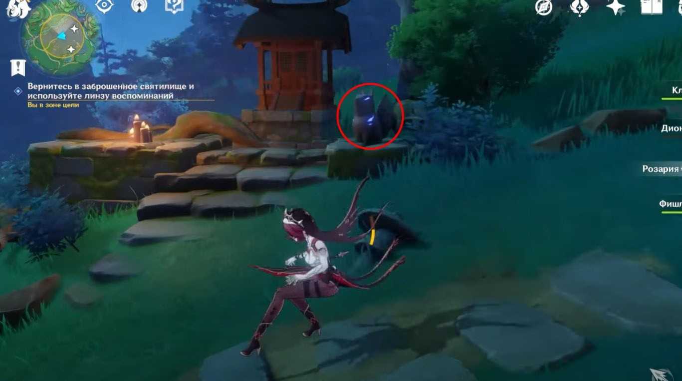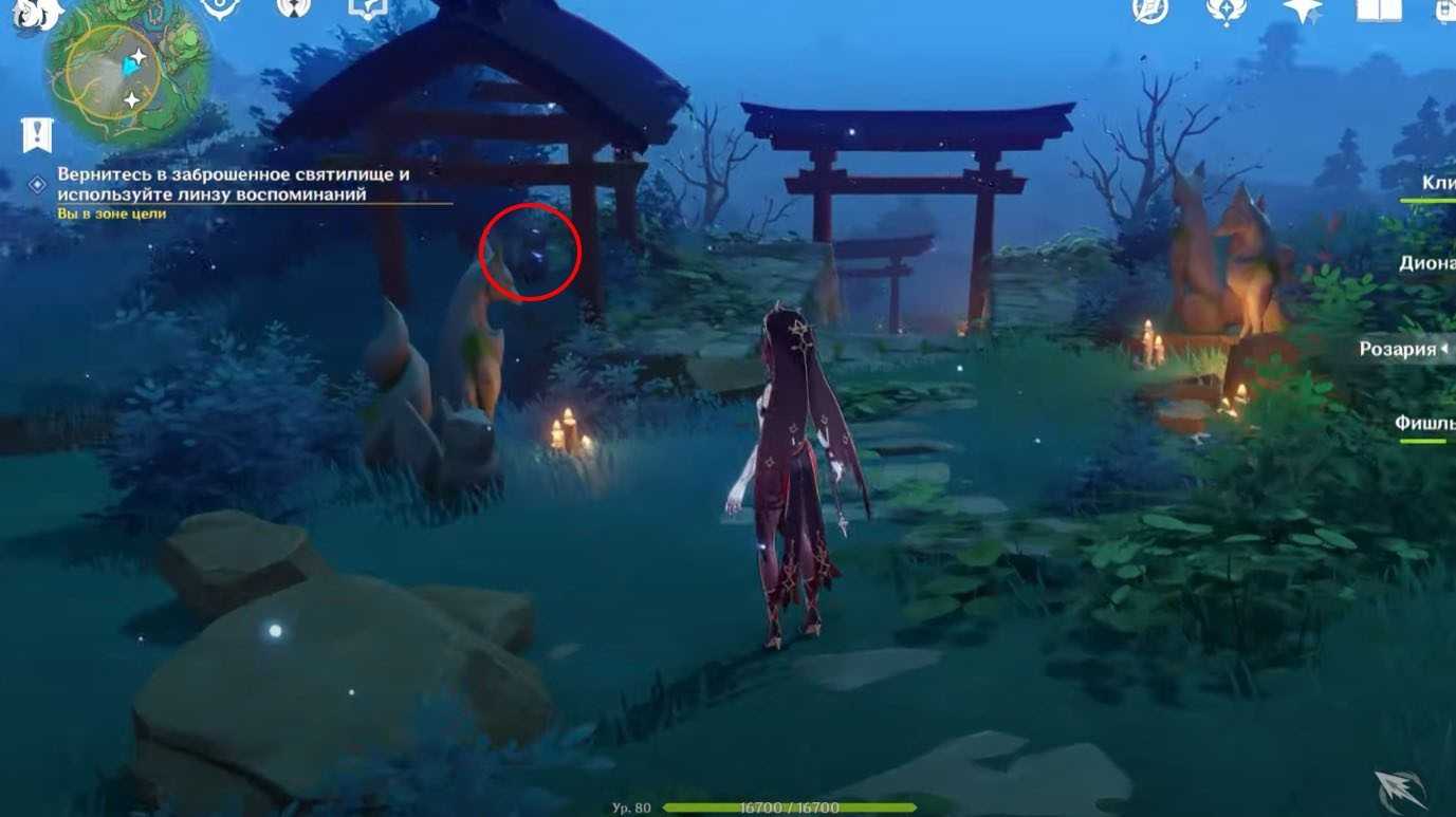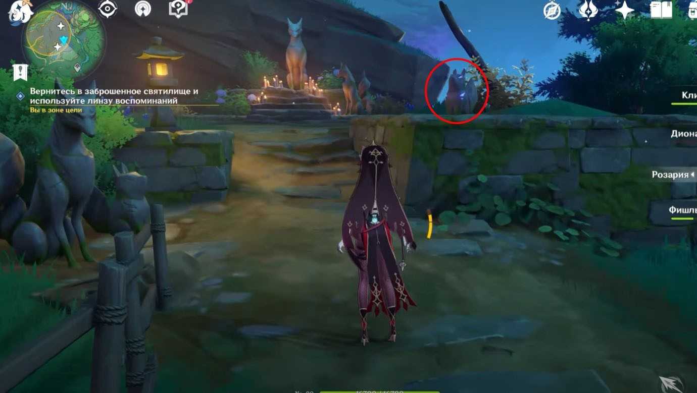 Направляйтесь к светящимся каменным статуям Кицунэ — область будет подсвечиваться на карте. Откройте инвентарь, «Инструменты» и наденьте линзу. Далее нажмите Z на клавиатуре, чтобы использовать ее. С помощью линзы посмотрите на восемь светящихся статуй кицунэ. Ниже на скриншотах представлены все 8 статуй.