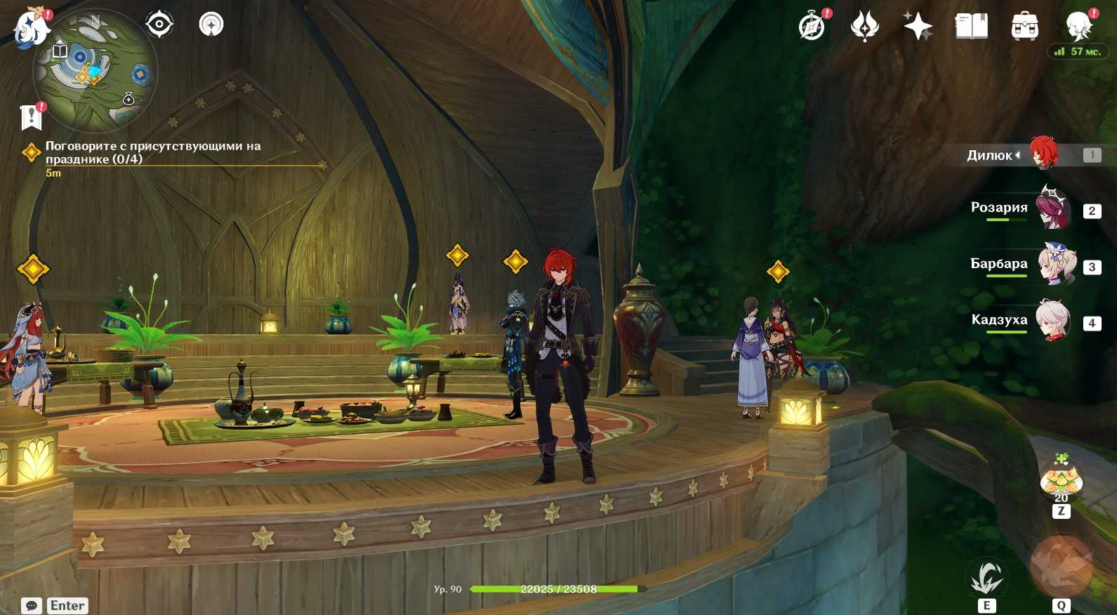 Передав всем послание Нилу, промотайте время игре с помощью часов в меню Паймон на 2 дня вперед до 19:00, а потом отправляйтесь на Большой базар в столицу Сумеру и примите участие в празднике. После кат-сцены поговорите с каждым из присутствующих.