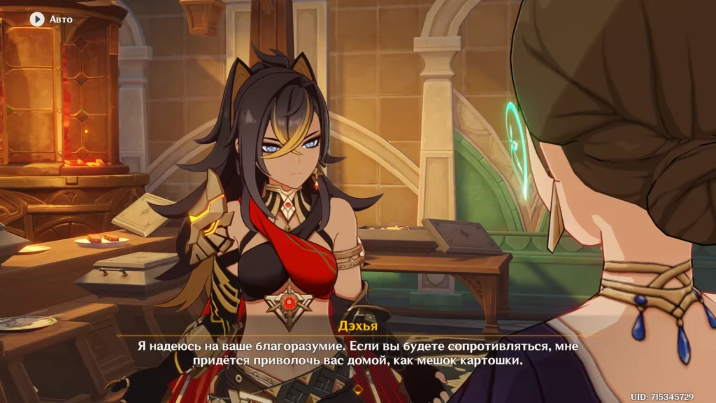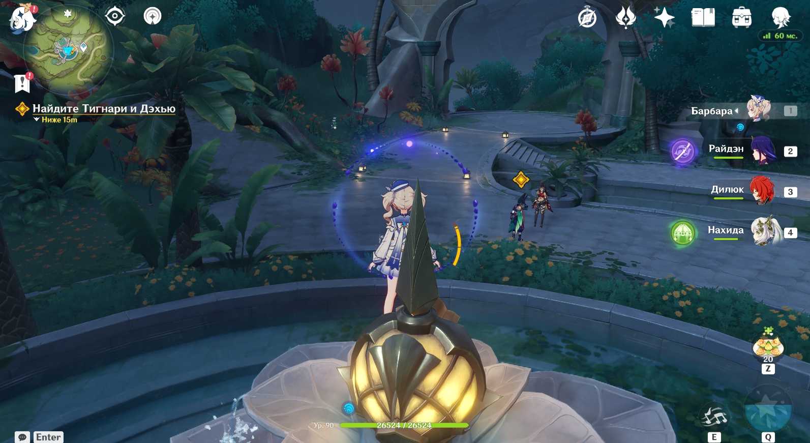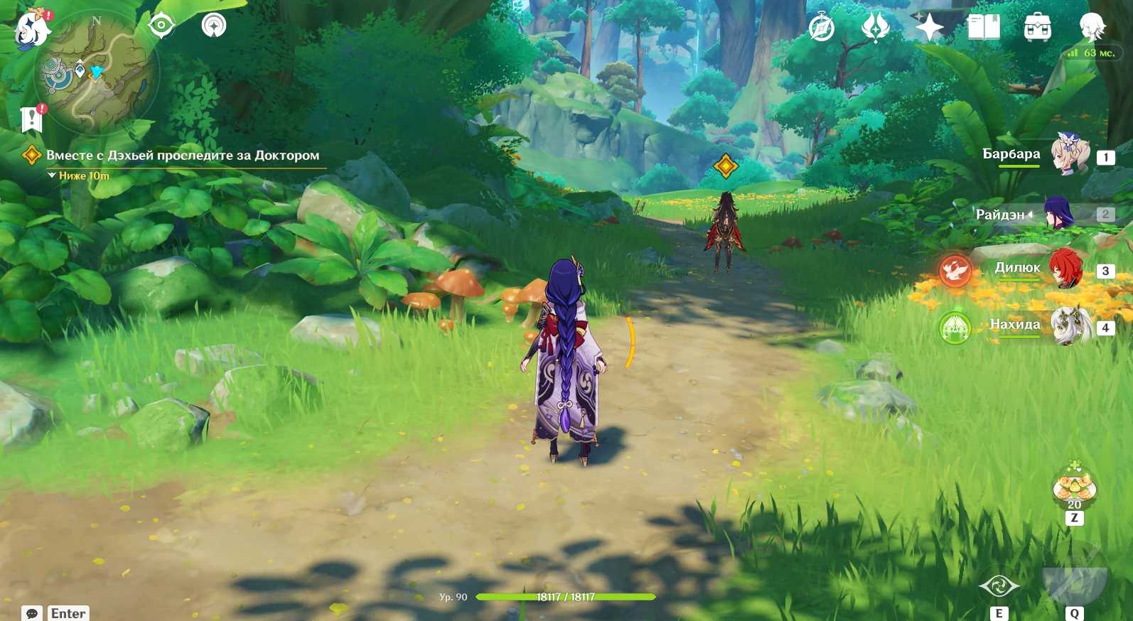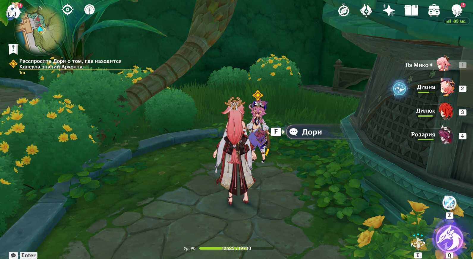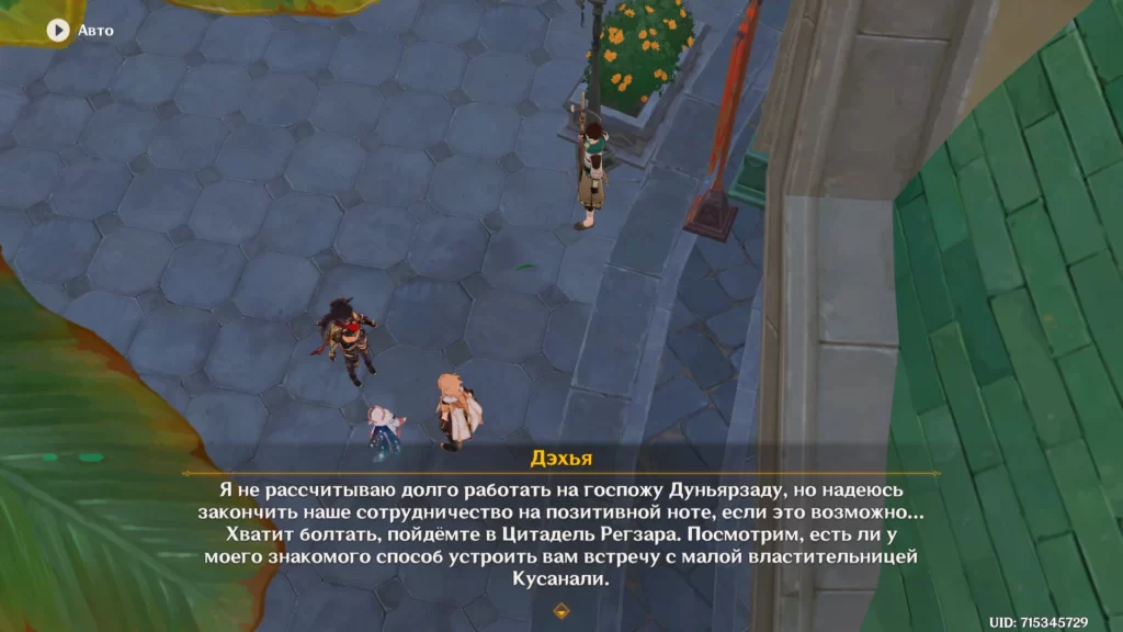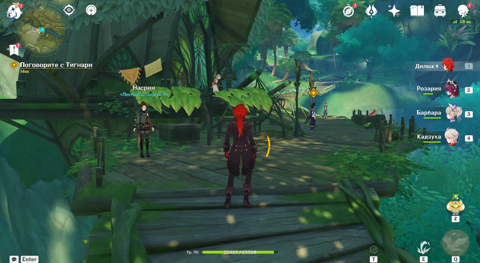 Телепортируйтесь в Караван-рибат и поговорите возле таверны с Дэхьей. Она скажет, что настало время повидать Тигнари и заручиться его поддержкой. Отправляемся в Пардис Дхяй.