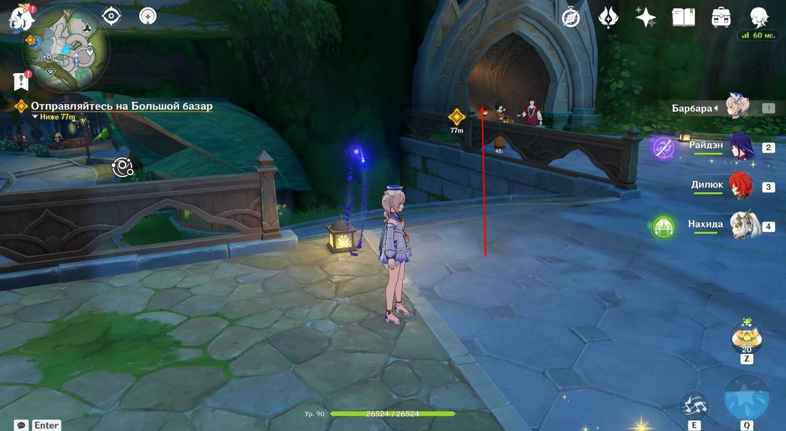 Телепортируйтесь в столицу Сумеру и идите на Большой базар. Вход в него находится рядом с НПС-алхимиком (см. скриншот ниже). На месте вас будут ждать Сайно и Аль-Хайтам. Во время кат-сцены к Путешественнице и ее собеседникам присоединится Нилу. Аль-Хайтам расскажет ей о наших планах на День Джнагарбхи и она согласится помочь нам ради властительницы Кусанали.