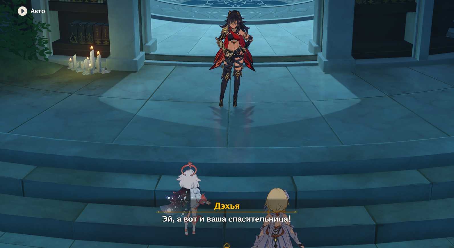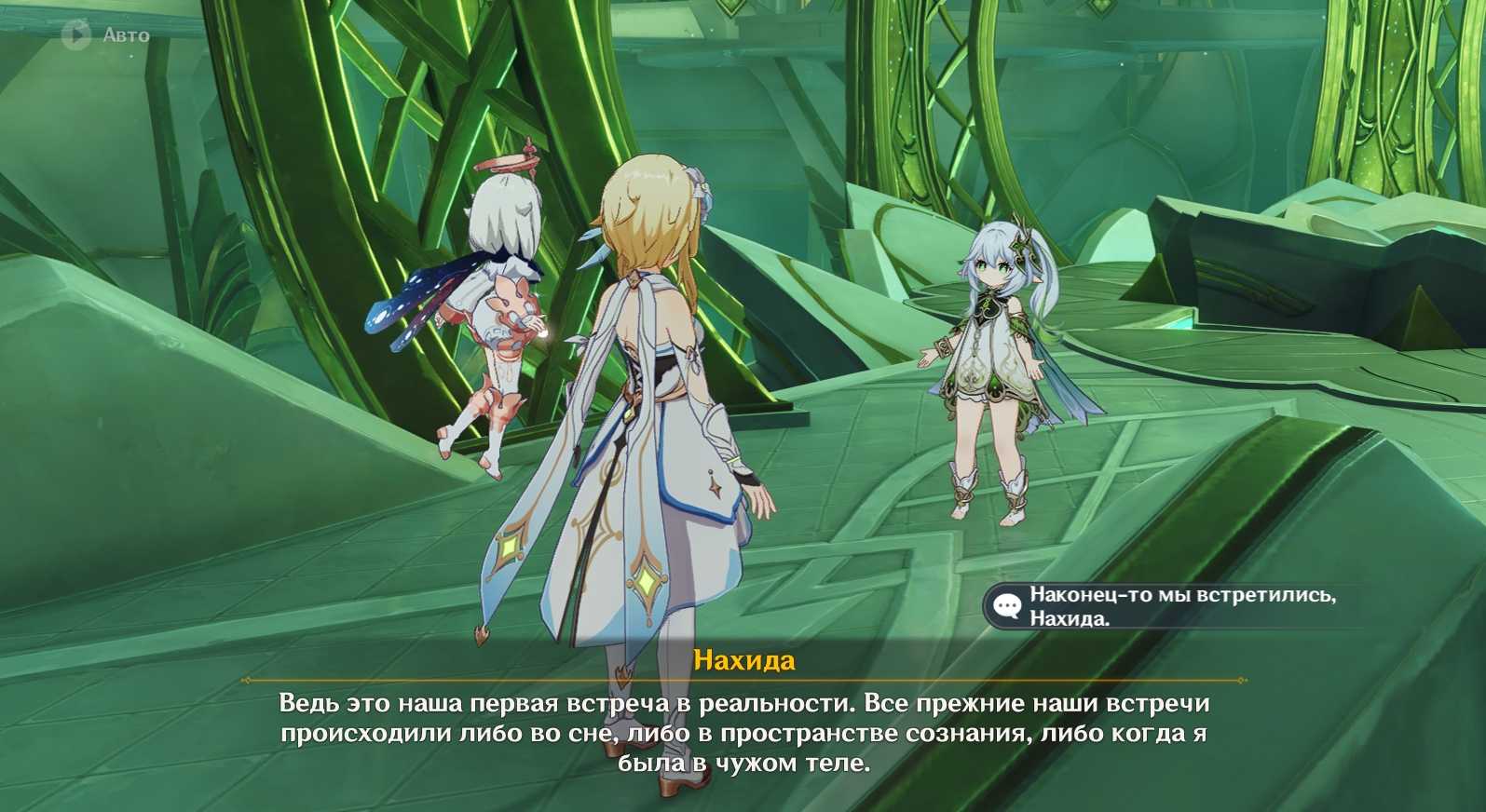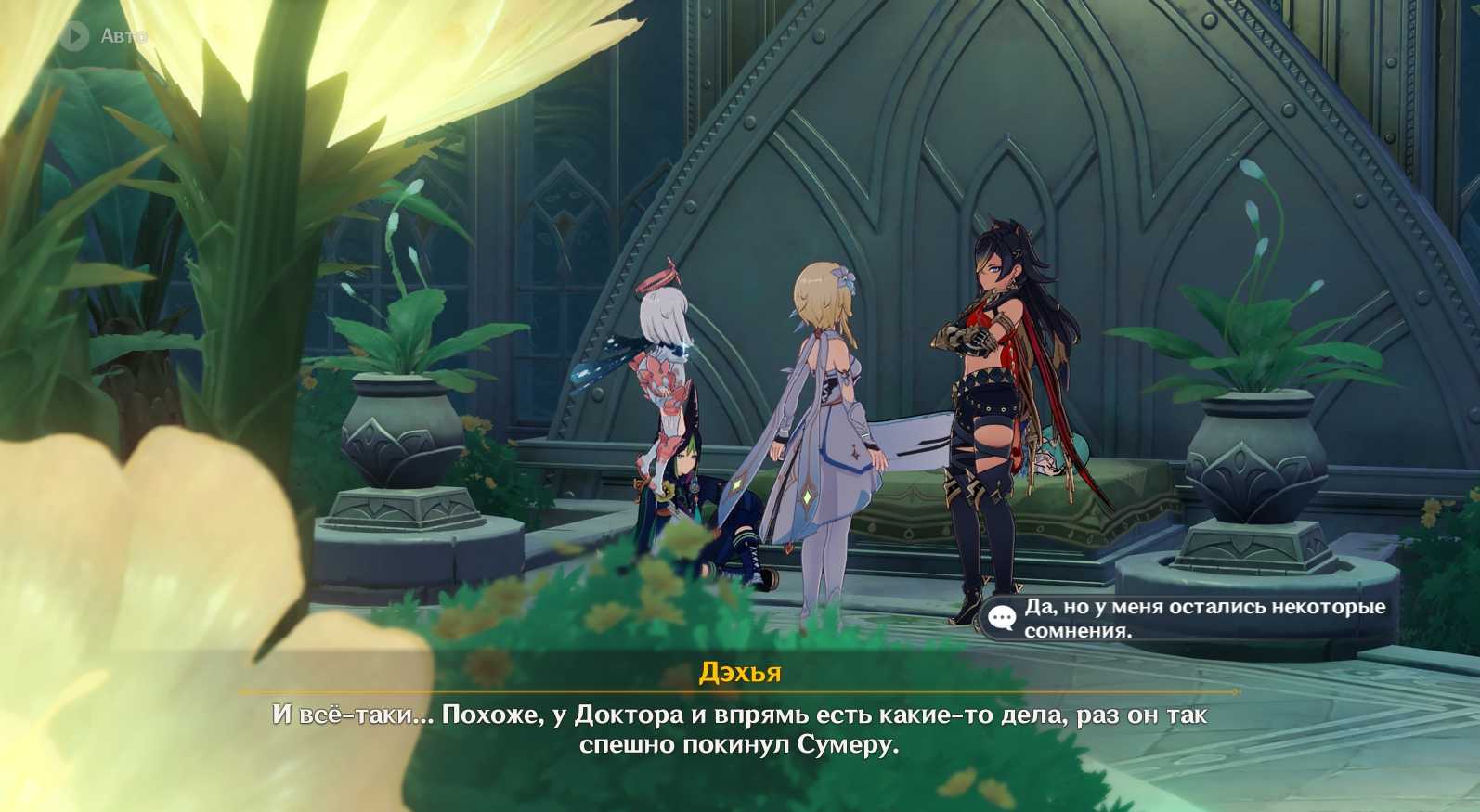 Сразу у телепорта мы встретим Нахиду. После беседы с ней поднимитесь наверх и поговорите с Хайпасией. Она покажет нам видения о прошлом Скарамуччи. Мы поймем, что с ней происходит что-то странное… На этом моменте запустится ролик. В ходе кат-сцены на Путешественницу и Нахиду нападут наемники. Во время драки Катерина пострадает, а Нахида успеет переселиться в главного героя. Когда ролик закончится, мы окажемся за пределами Пардис Дхяй в компании Тигнари. Он сообщит, что Дотторе пленил создание Нахиды в Храме Сурастаны и она больше не сможет нам помогать.