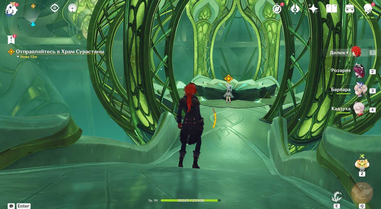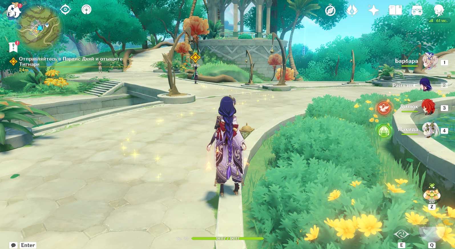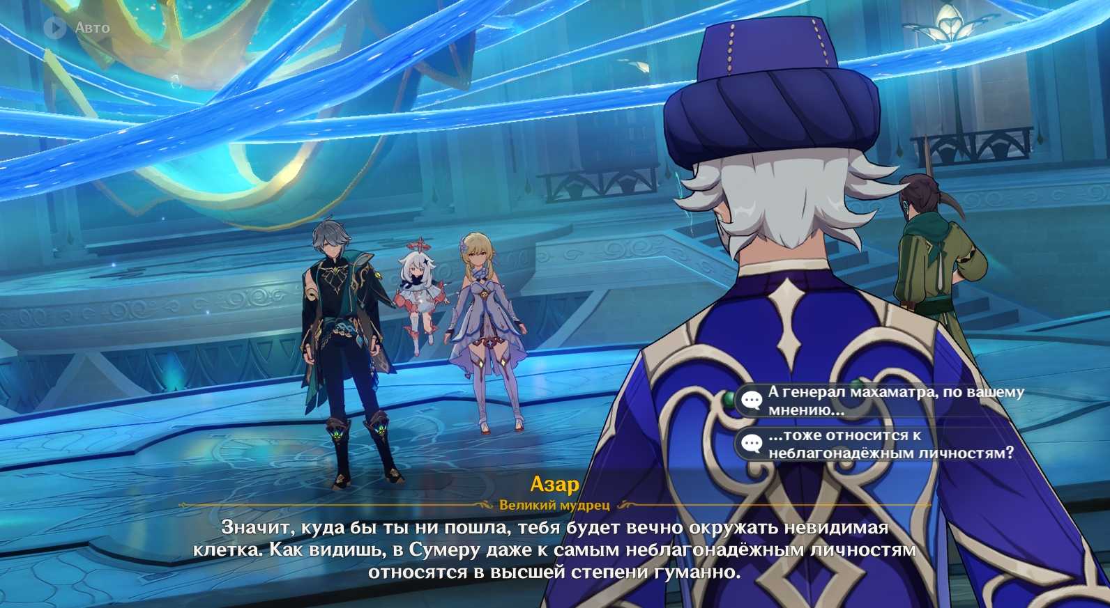 Сразу у телепорта мы встретим Нахиду. После беседы с ней поднимитесь наверх и поговорите с Хайпасией. Она покажет нам видения о прошлом Скарамуччи. Мы поймем, что с ней происходит что-то странное… На этом моменте запустится ролик. В ходе кат-сцены на Путешественницу и Нахиду нападут наемники. Во время драки Катерина пострадает, а Нахида успеет переселиться в главного героя. Когда ролик закончится, мы окажемся за пределами Пардис Дхяй в компании Тигнари. Он сообщит, что Дотторе пленил создание Нахиды в Храме Сурастаны и она больше не сможет нам помогать.