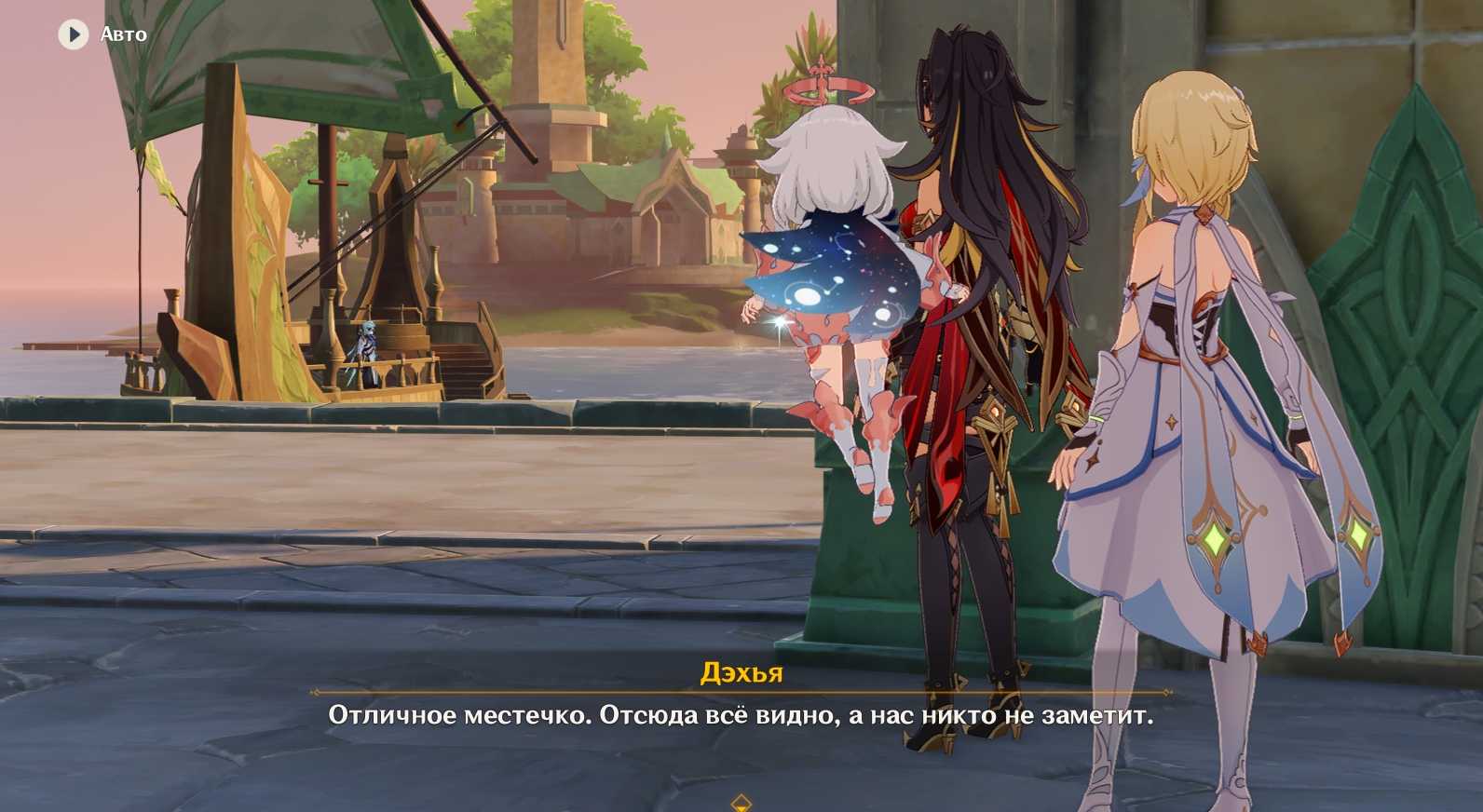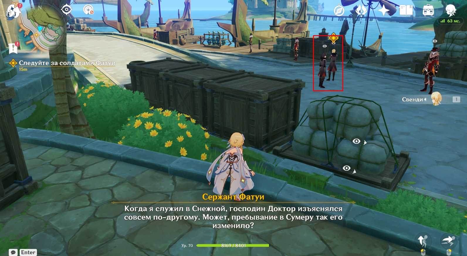 Когда кат-сцена закончится, вы окажетесь за пределами Пардис Дхяй. Идите за Дэхьей, которая сумеет найти следы Доктора. Ей удалось узнать, что Предвестник направился в Порт-Ормос. Телепортируйтесь туда и проследите за солдатами Фатуи. Ваша цель отмечена желтым квестовым маркером.