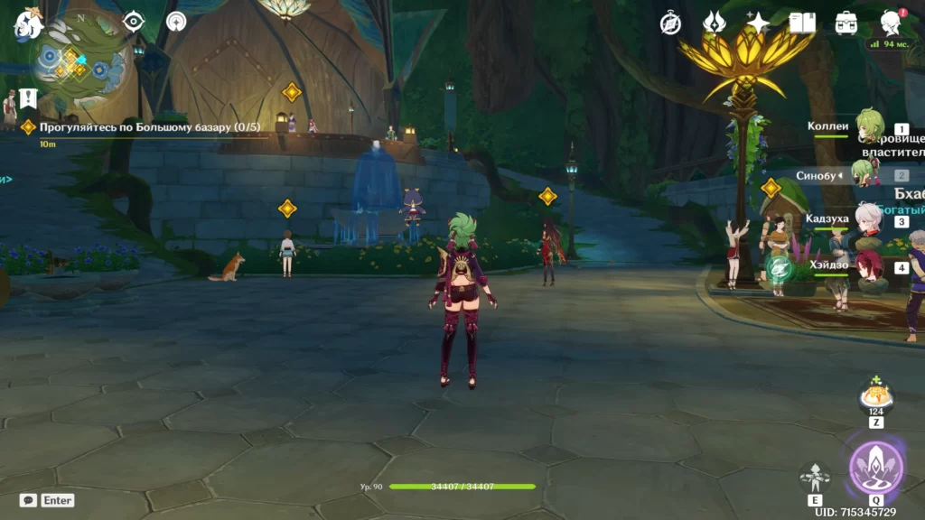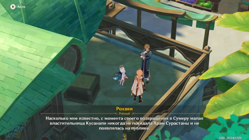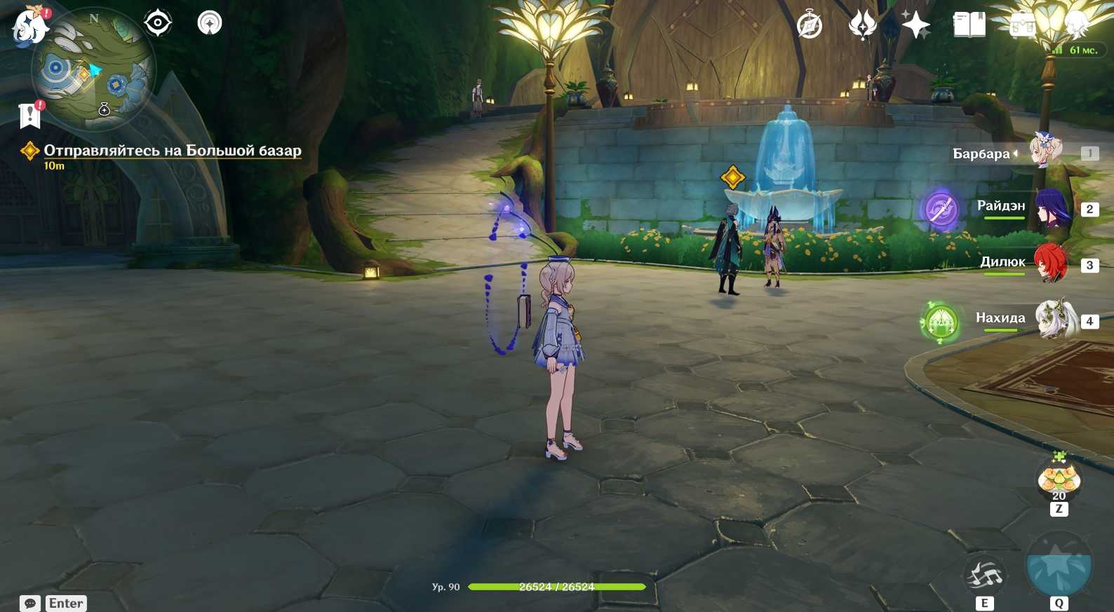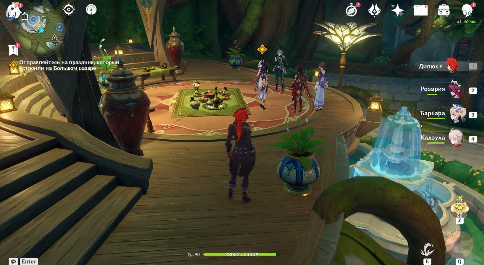 Далее телепортируйтесь в столицу Сумеру, посетите Большой базар и поговорите с Нилу. Она скажет, что разослала приглашения на праздник многим из наших знакомых, но пришли только Путешественница и Паймон. Мы должны поговорить с приглашенными и узнать, как у них дела.