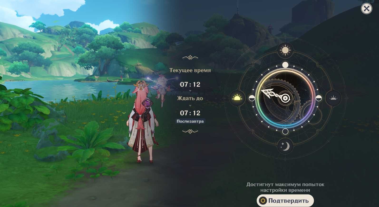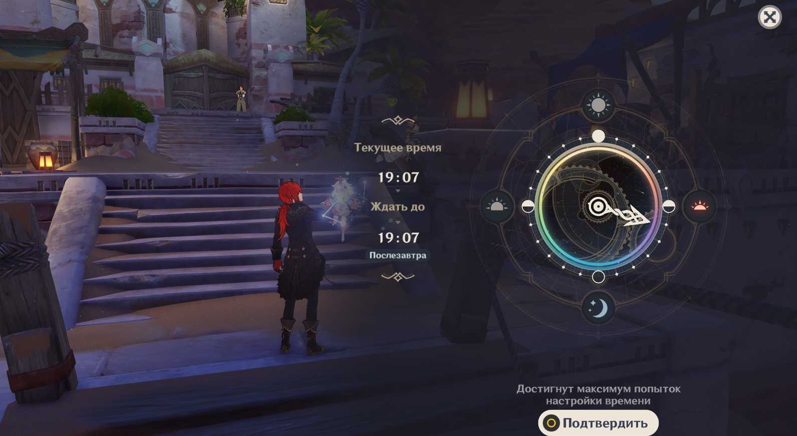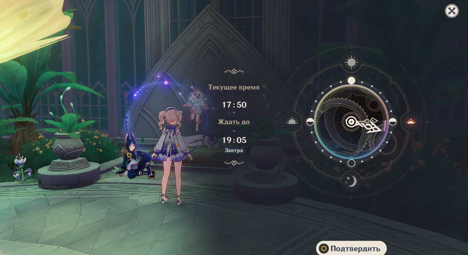 Отыскав друзей, вернитесь в здание, где лежит Хайпасия, и расскажите им о встрече с образом Скарамуччи. После этого используйте внутриигровые часы в меню Паймон, чтобы промотать время до 19:00.