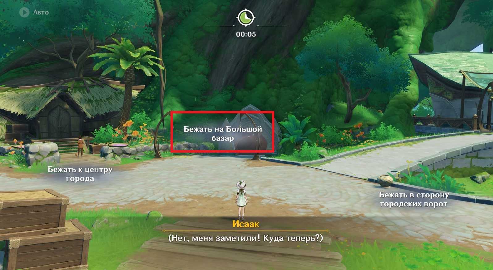 У нее все получилось. Далее в дело вступает малыш Исаак. Он переоденется в костюм Нахиды и попытается привести стражников на Большой базар, где их уже ждут Пустынники вместе с Дэхьей. Чтобы мальчик не попался в руки стражи, выбирайте следующие варианты: