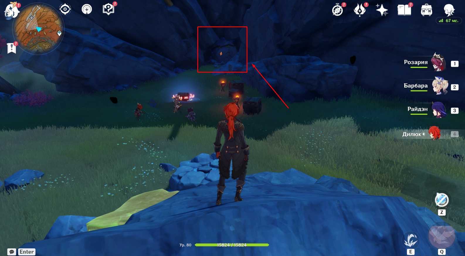Добравшись до места, отмеченного на скриншоте выше, вы увидите лагерь хиличурлов и проход в скале, заваленный камнем с изображением необычного символа. За этим камнем и находится вход в подземелье. Чтобы открыть его, сделайте следующее: