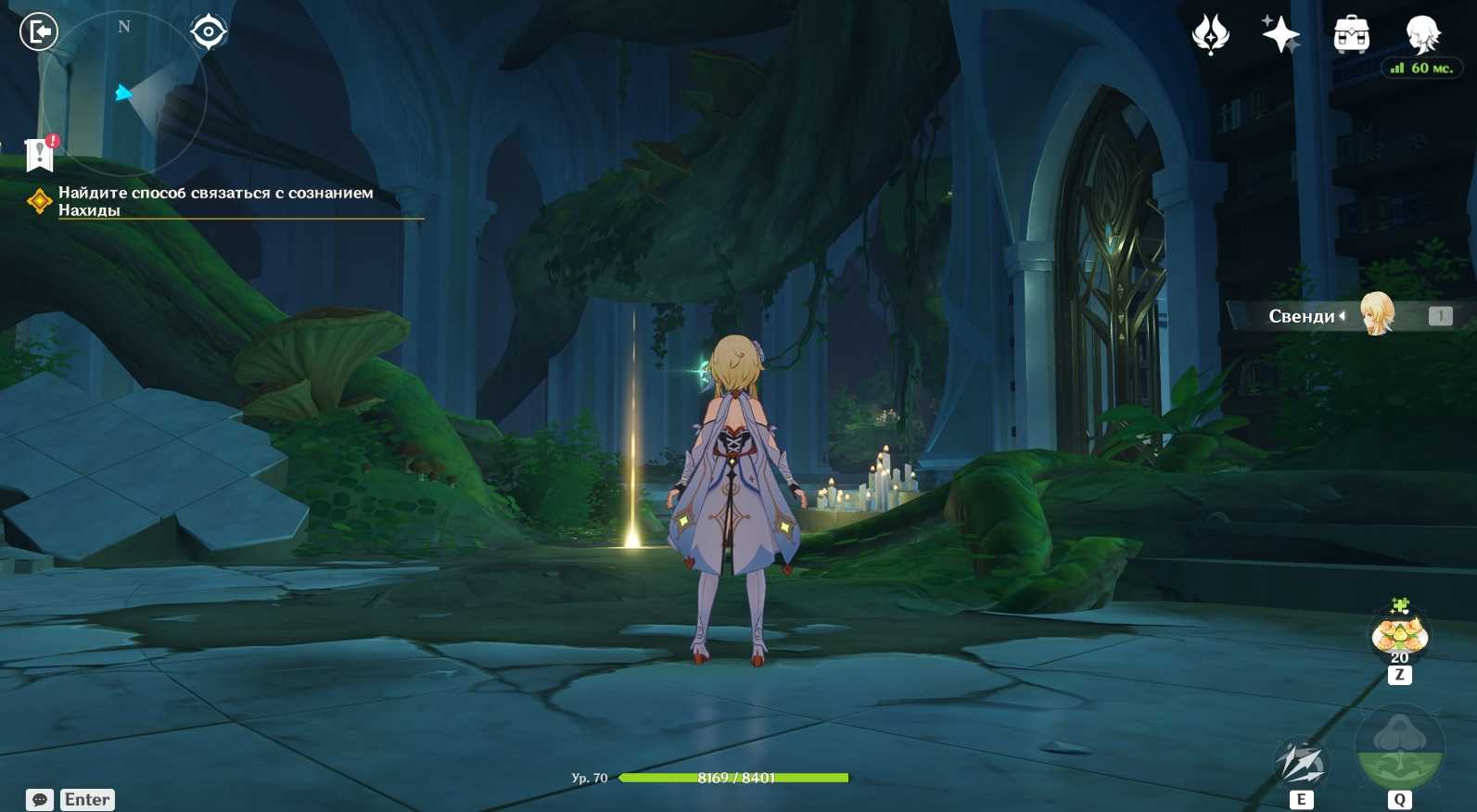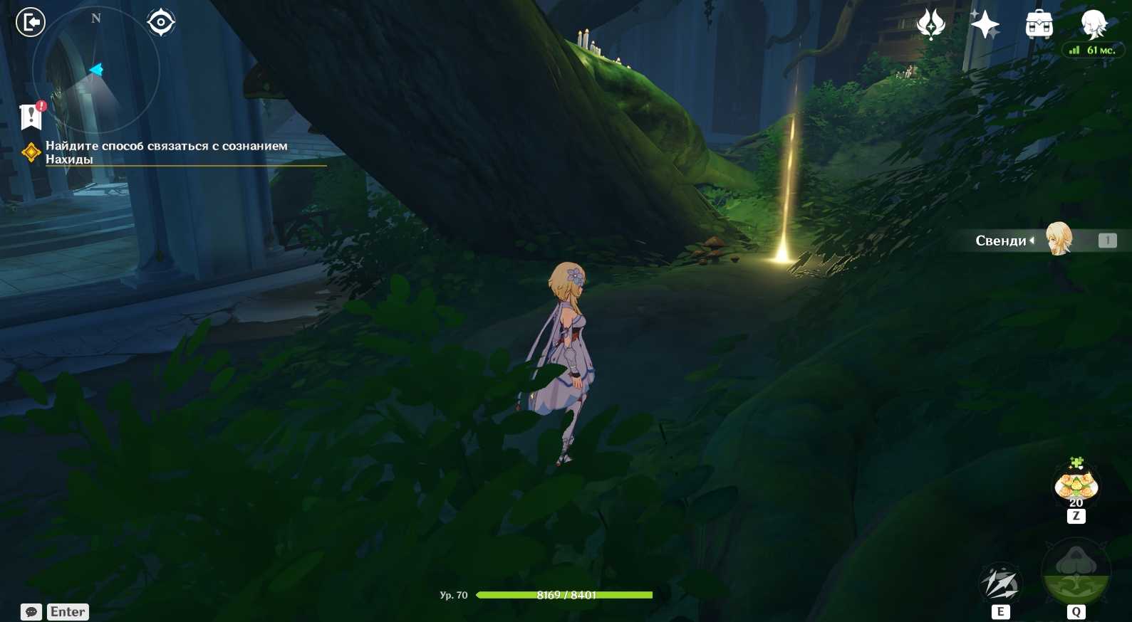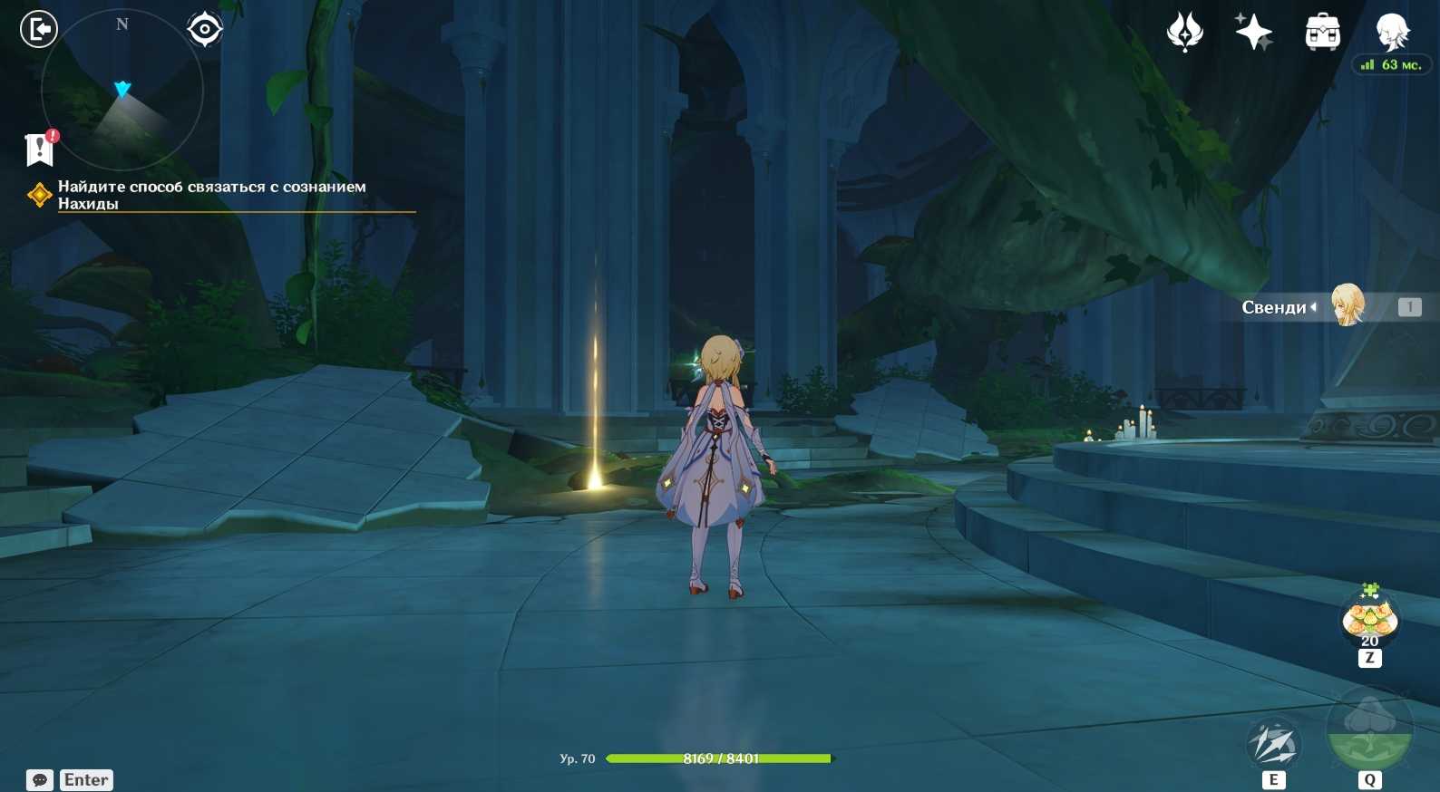 На этом месте сигнала нет. Идите дальше по внутреннему кругу, пока не наткнетесь на еще одно желтое свечение. Взаимодействуйте с ним, а потом перейдите на внешний круг темницы. Возле огромного корня находится последнее желтое свечение. Здесь вы сможете установить связь с сознанием Нахиды и разбудить ее.
