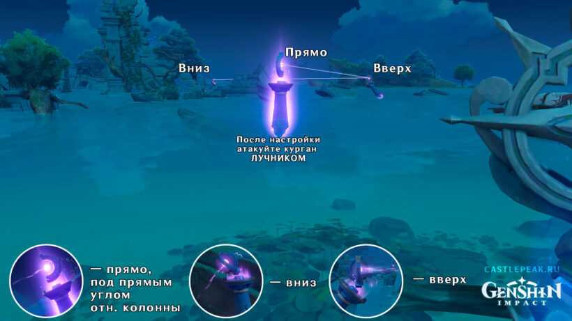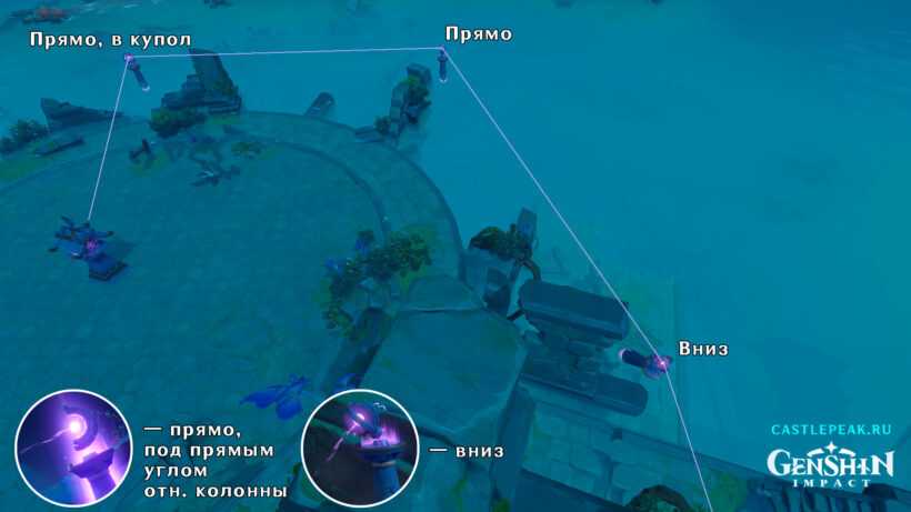 После того как выровняете все Электро столбы, ударьте в светящийся фиолетовый шар первого монумента. Можете использовать бойца как ближнего, так и дальнего боя (скорее всего, требуется Электро персонаж). В результате вы запустите реакцию и начнется кат-сцена. Если вы где-то ошиблись, то ничего не произойдет.