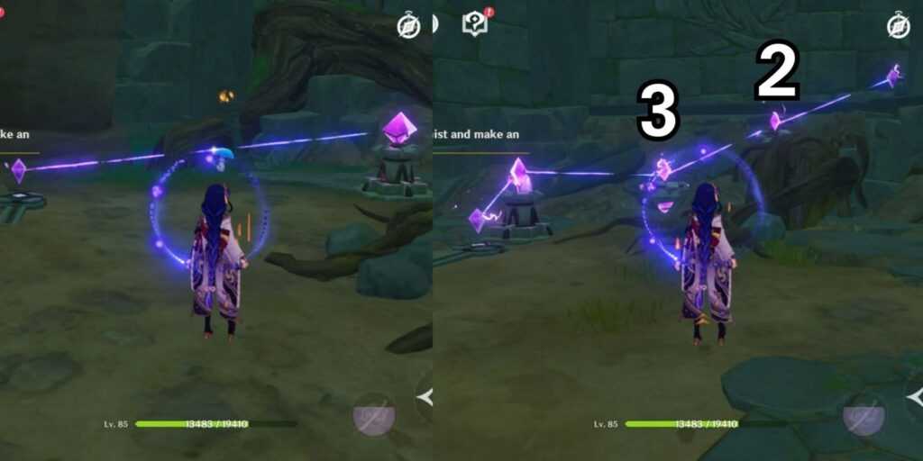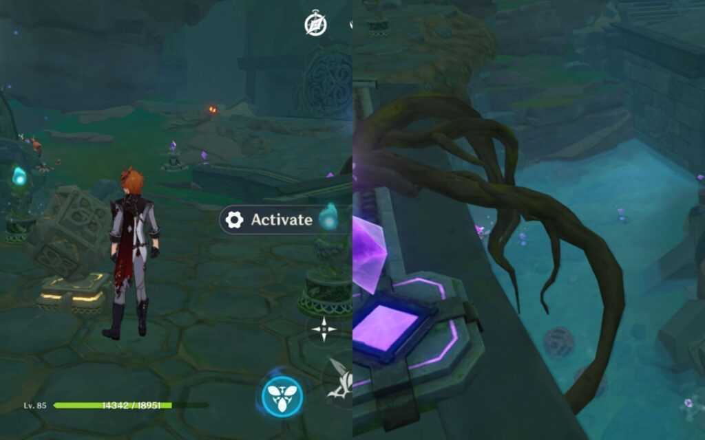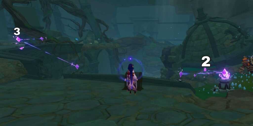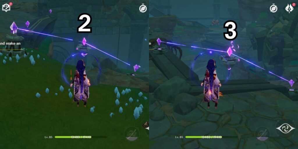 Возьмите ее и снова следуйте за феей, которая приведет вас назад к статуе птицы. Поместите табличку в место, показанное на скриншоте ниже. Затем следуйте за вторым духом. Поднимите очередной артефакт и вернитесь назад, чтобы активировать постамент. Теперь бегите за третьей феей. Карабкайтесь за ней наверх по скале. Разберитесь с двумя хиличурлами и выкопайте нужный предмет. Их расположение показано на скриншотах ниже.