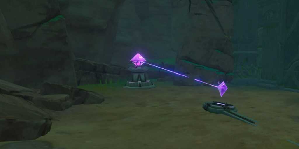 К юго-востоку от Великого храма Наруками можно обнаружить парящий остров, на котором имеется релейный камень. Возьмите его. Теперь вам нужно будет установить его таким образом, чтобы Электро фея перебралась с одной стороны ущелья на другую.