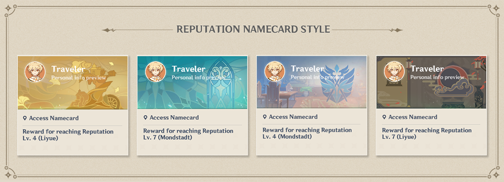 Когда ваша репутация в Мондштадте достигнет уровня 4, вы получите именную карту «Почётный рыцарь», а после уровня 7 — именную карту «Молитва».Когда ваша репутация в Ли Юэ достигнет уровня 4, вы получите именную карту «Паруса», а после уровня 7 — именную карту «Среди облаков».