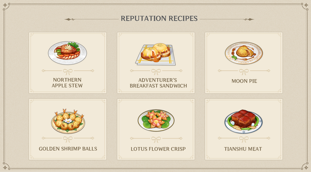 Когда ваша репутация в Мондштадте достигнет уровня 1, вы получите рецепт тушёного мяса с яблоками.Когда ваша репутация в Мондштадте достигнет уровня 4, вы получите рецепт яичной крепости.Когда ваша репутация в Мондштадте достигнет уровня 7, вы получите рецепт лунных пряников.Когда ваша репутация в Ли Юэ достигнет уровня 1, вы получите рецепт шариков с креветками.Когда ваша репутация в Ли Юэ достигнет уровня 4, вы получите рецепт печенья лотоса.Когда ваша репутация в Ли Юэ достигнет уровня 7, вы получите рецепт мяса «Тяньшу».