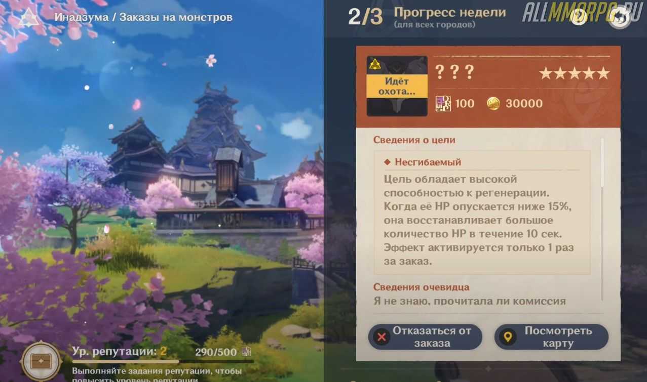Обратите внимание! Заказы на монстров и просьбы жителей становятся доступны после получения 2 уровня репутации в Инадзуме. Мы рекомендуем вам в первую очередь сделать задания Архонтов, за которые полагается по 100 очков опыта и как можно быстрее исследовать территорию региона