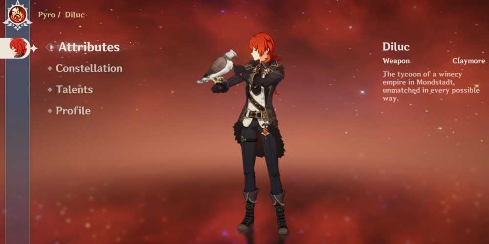 Diluc — один из пионеров Main DPS в игре. Быть пользователем Claymore и владельцем Pyro Vision делает его смертоносным персонажем. Он атакующий персонаж, который может сломать почти любой тип щита. Он может наносить постоянный огненный урон и может победить нескольких врагов, используя свой Elemental Burst.