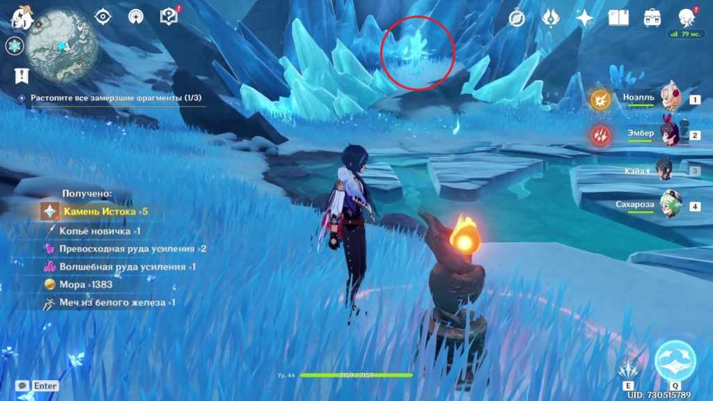 Отправляйтесь к месту, указанному на изображении ниже. Это недалеко от точки телепорта, поэтому вы запросто найдете нужную область. Там вы увидите 5 тотемов, которые необходимо активировать в определенном порядке (для этого ударьте монументы Крио атаками) – следите за летающей феей или повторите комбинацию, показанную на скриншоте.