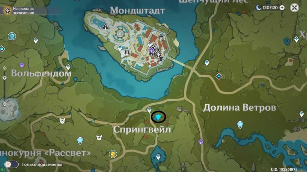 Клорис — старшая сестра цветочницы Флоры. Она тоже занимается растениями, но в отличие от младшей сестрички, не любит сидеть на месте. Встретить ее вы сможете у главной дороги между Долиной ветров и Храмом Тысячи ветров, к востоку от Мондштадта. Примерное местонахождение указано на скриншоте карты.