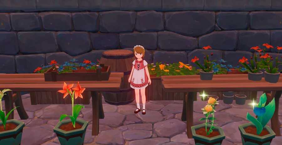Флора — одна из главных цветочниц Мондштадта. Находится она на юго-востоке города рядом с лестницей — вы без труда обнаружите несколько столов с яркими цветочками и миловидной девушкой в розово-белом платье. У Флоры вы купите: