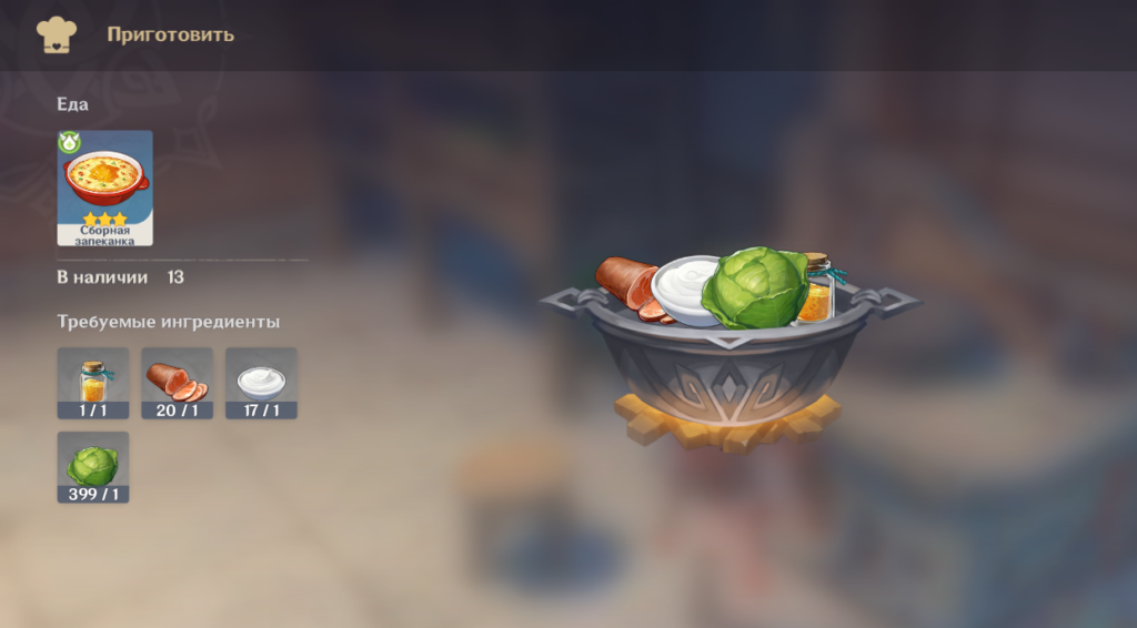 На данный момент у неё самый высокий уровень исцеления, который дает оживляющая еда в Genshin Impact, примерно от 900 до 1500 HP в зависимости от качества или того, кто её приготовил. К сожалению, несмотря на то, что это лучшая еда для возрождения, игрокам будет сложно приготовить Сборную запеканку в достаточном количестве. Для этого требуется 1 крабовая икра, 1 ветчина, 1 сметана и 1 капуста.