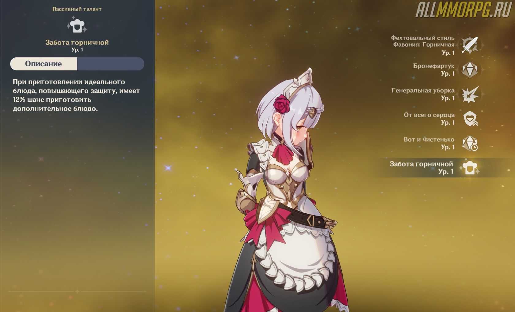 | Ноэлль | «Забота горничной» | Во время готовки идеального блюда с эффектом на увеличение защиты с шансом в 12% получится дополнительное блюдо |