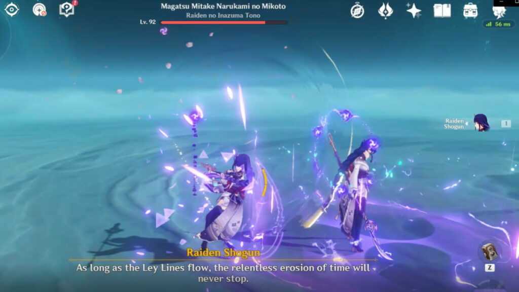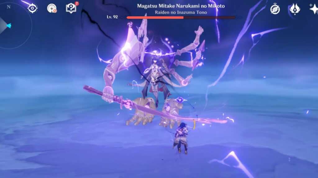 После короткой заставки еще один одиночная битва с использованием Эй подскажет. Вы столкнетесь с настоящим боссом Raiden Shogun: Магацу Митаке Наруками-но Микото. Эй будет все время находиться в Musou Shinsetsu (ее Elemental Burst), что немного облегчит битву. Ты также может потреблять посуду чтобы повысить ее атаку и помочь с выживаемостью.