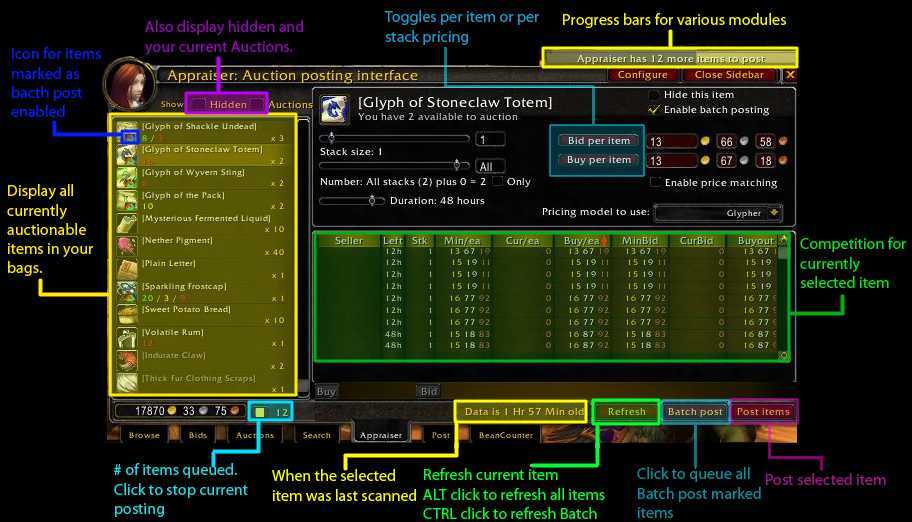 Аддон предоставляет вам инструменты и данные, которые помогут вам принять трудное решение проще. От покупки до продажи лотов, Auctioneer использует подсказки и инструменты проверенные временем, что должно помочь вам заработать немало золота.