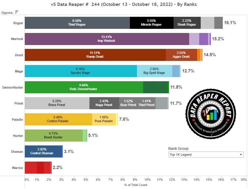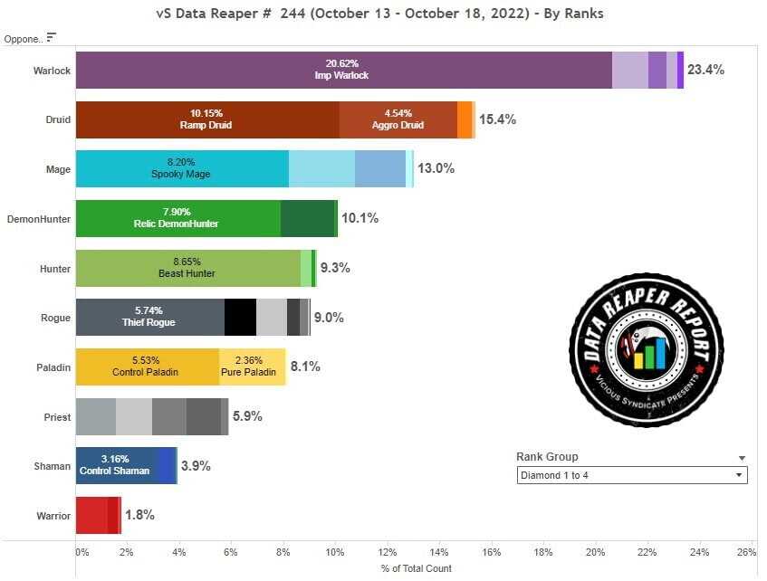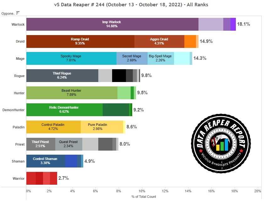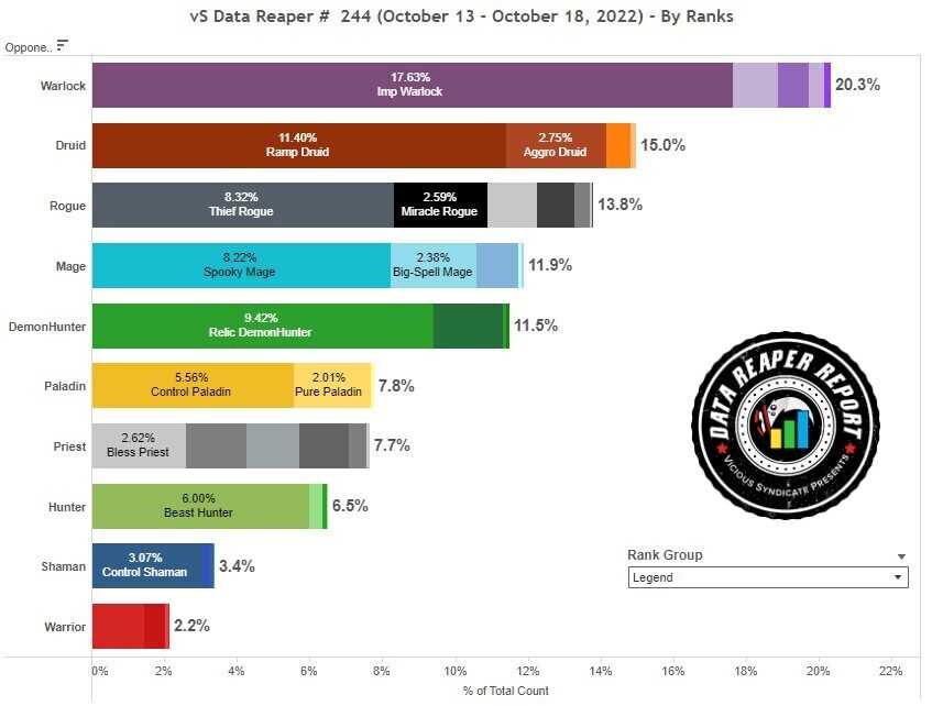 Примечание: среди всех рангов самым популярным классом после изменений баланса стал Чернокнижник (18.1%). Вторым – Друид (14.9%), а третьим – Маг (14.3%). Охотник, в адрес которого и были направлены те самые изменения, замыкает первую пятёрку, отставая от Чернокнижника почти вдвое (9.5%).