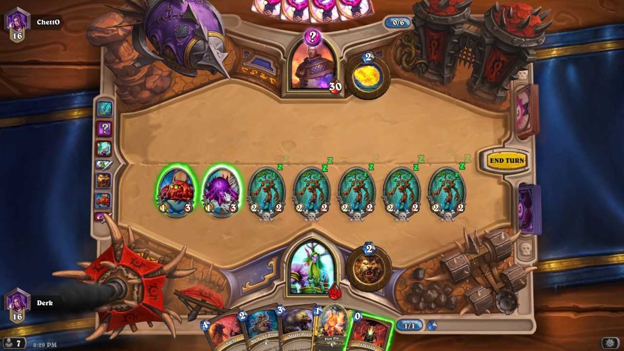 В агрессивных матч-аппах задавить противника при помощи мелких угроз на раней стадии игры не получится. На начальном этапе сражения такому архетипу Друида по факту нечем ответить. Ваша задача состоит в том, чтобы разогнаться по манне и ресурсам. Альтернативным способом будет заспамить стол мелкими картами, дабы создать угрозу для соперника, ведь вы их можете забаффать.