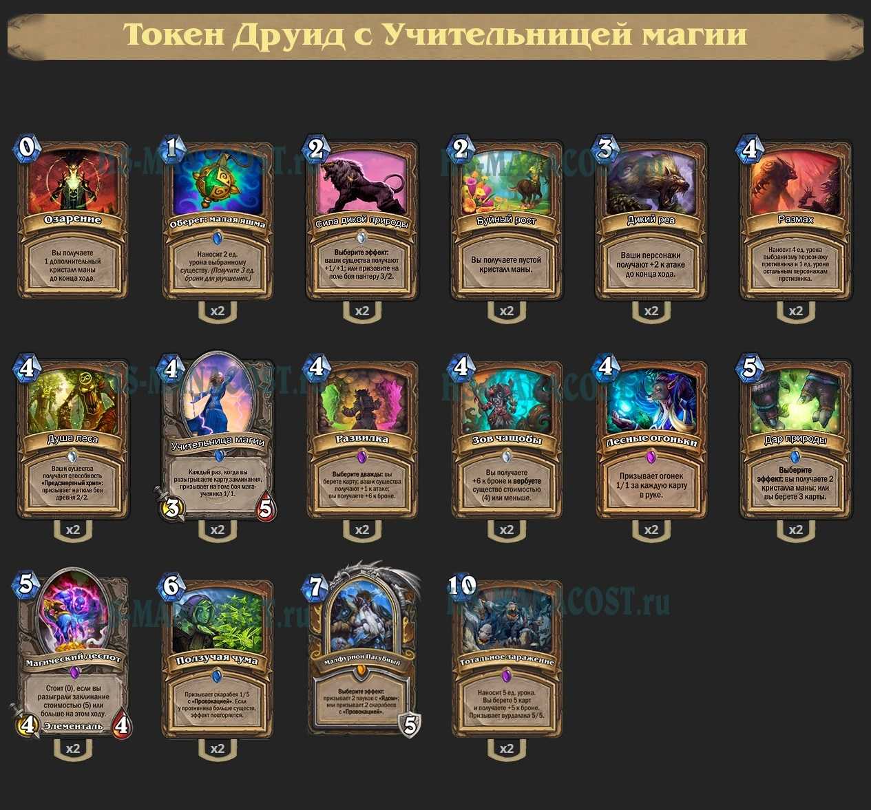 Токен Друид, который играет через “Учительницу Магии” известен еще с времен “Ведьминого леса” множеству игроков. Комбинация карт “Зов чащобы” и “Учительница магии” помогает игроку на ранних ходах существенно заспамить стол существами, вернее “Учениками”, которые способны наносить множество дополнительного урона. Использование “Озарения” как и было сказано ранее, не только способствует отсутствию переполнения руки при розыгрыше “Тотального заражения”, но и как всем известно дает дополнительный кристалл манны.