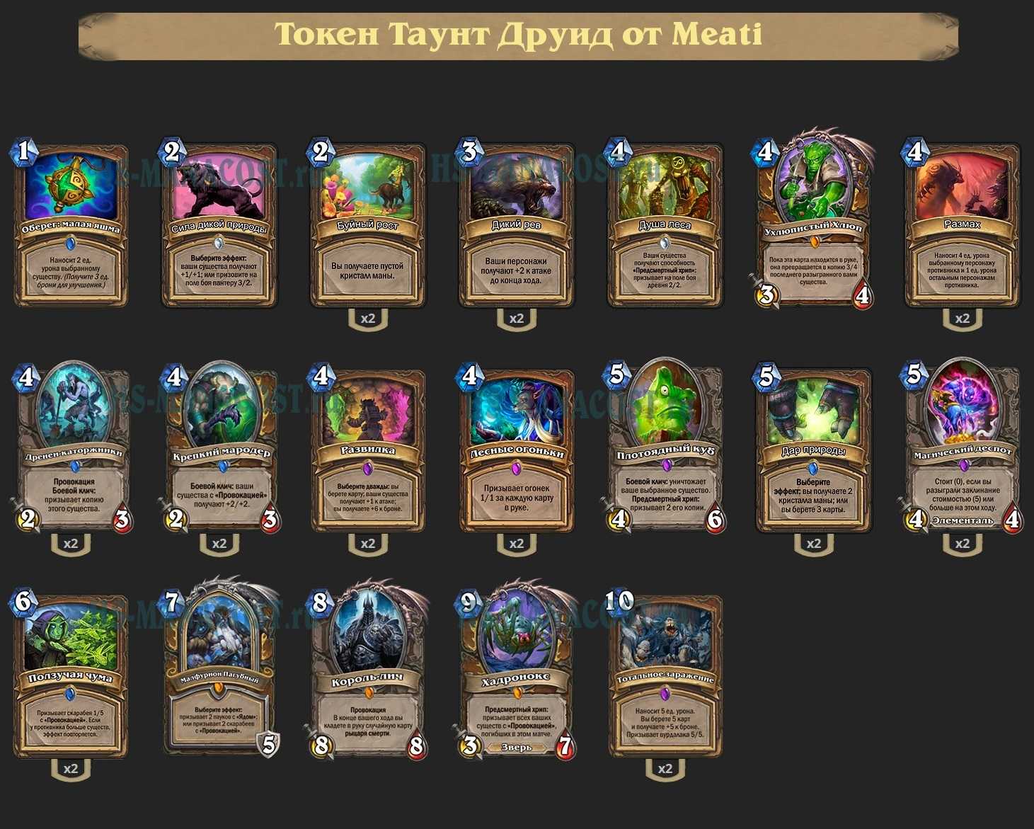 Игрок под никнеймом “Meati” нашел одно из самых шикарных решений для колоды Токен Друида. Гибрид Meati был весьма похож на смесь Таунт и Токен Друида. Такой вывод напрашивается прежде всего по причине того, что Meati смешал провокации с Ходроноксом, Королем Личем (который также является отличной провокацией, с мощными характеристиками) и Плотоядные кубы. Более детально мы рассмотрим данную модификацию деки от Меати немного ниже. Сейчас же хотелось бы немного поведать о колоде, в которой игра протекает при помощи “Учительницы магии”.