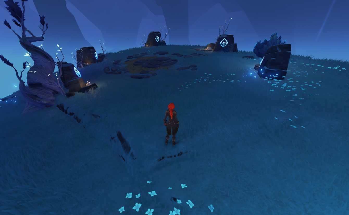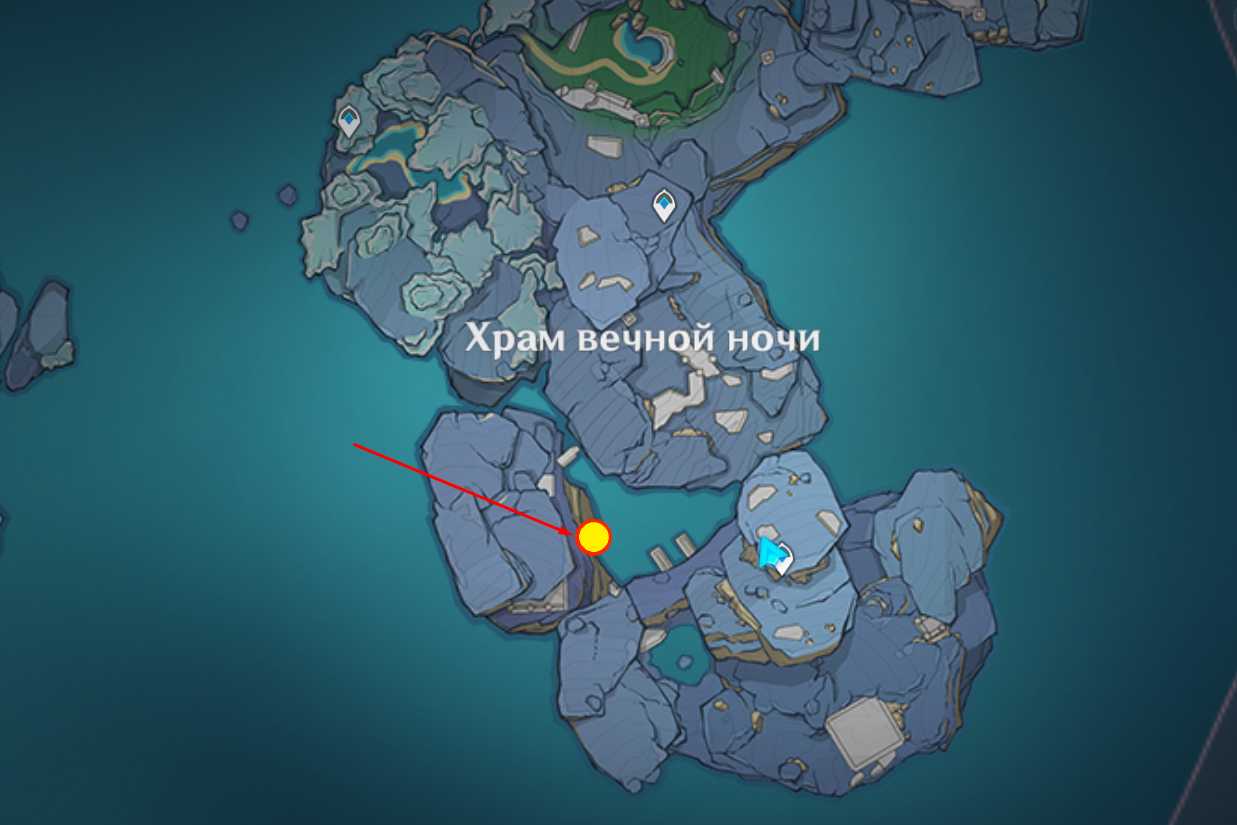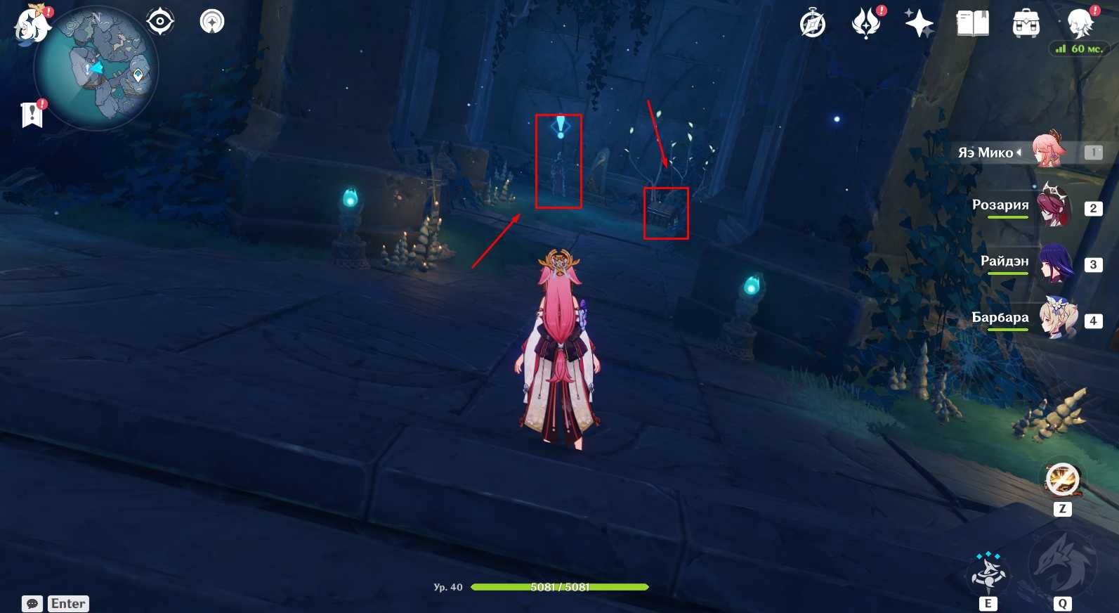 Придя на отмеченное на скриншоте место, вы увидите комнату с двумя пиро-факелами, заблокированным сундуком и двумя Стражами руин. Как только вы приблизитесь к сундуку, стражи активируются и нападут на вас. Убейте их, заберите добычу из сундука, а потом зажгите факелы с помощью стихийных атак любого пиро-героя.